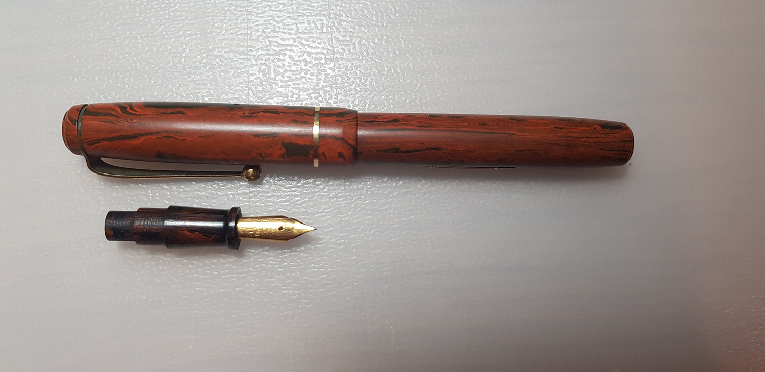 La tua penna è in ebanite fiammata, in buono stato, neppure troppo ossidata. (La colorazione dell'impugnatura è quella originale).