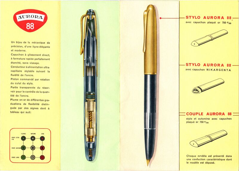 “La 88 è equipaggiata da un pennino coperto da una guaina in ebanite sulla cui base è riportato il logo ovoidale dell'Aurora riportante al suo interno la dicitura Aurora 88. Sul lato opposto della sezione viene riportato un numero di serie, purtroppo non esiste una corrispondenza accertata che consenta di correlarlo al periodo di produzione, ma viene riportato che ad inizio del 1952 erano state vendute 750000 penne, passando il milione alla fine dell'anno.”