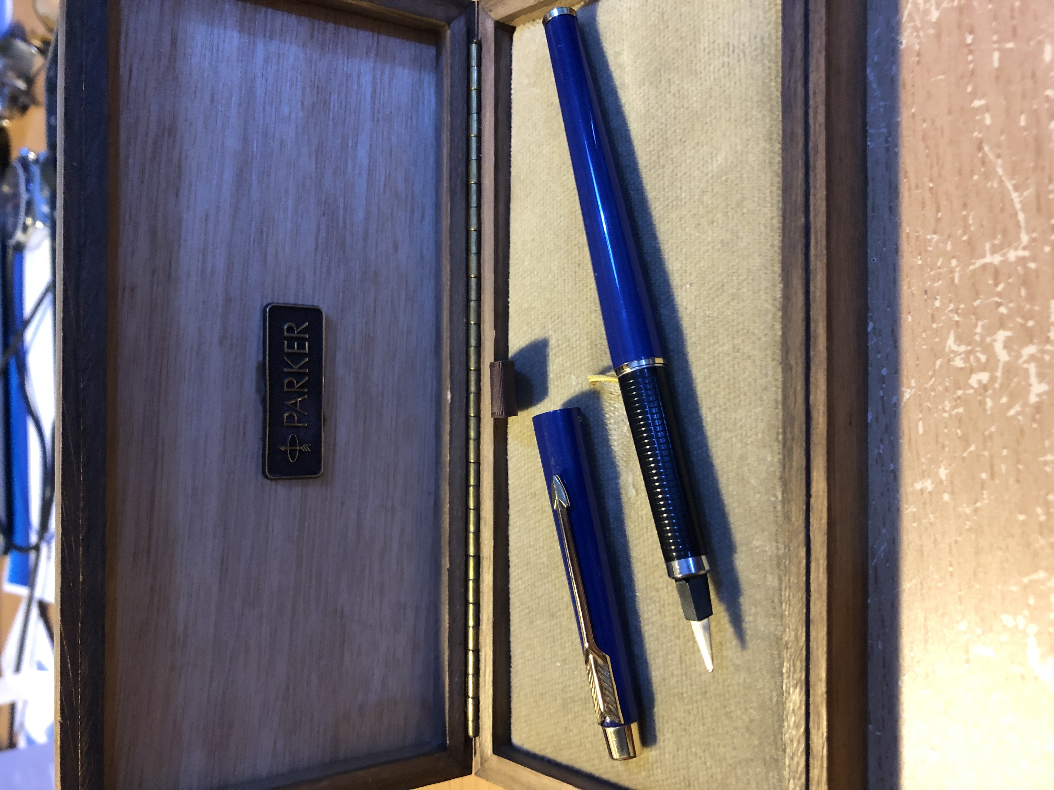Ho trovato una bella Parker in ottime condizioni (NOS) in un mercatino. Dalla forma del pennino la si poteva scambiare per una 180 (pennino triangolare reversibile che sembra un'arma bianca....)