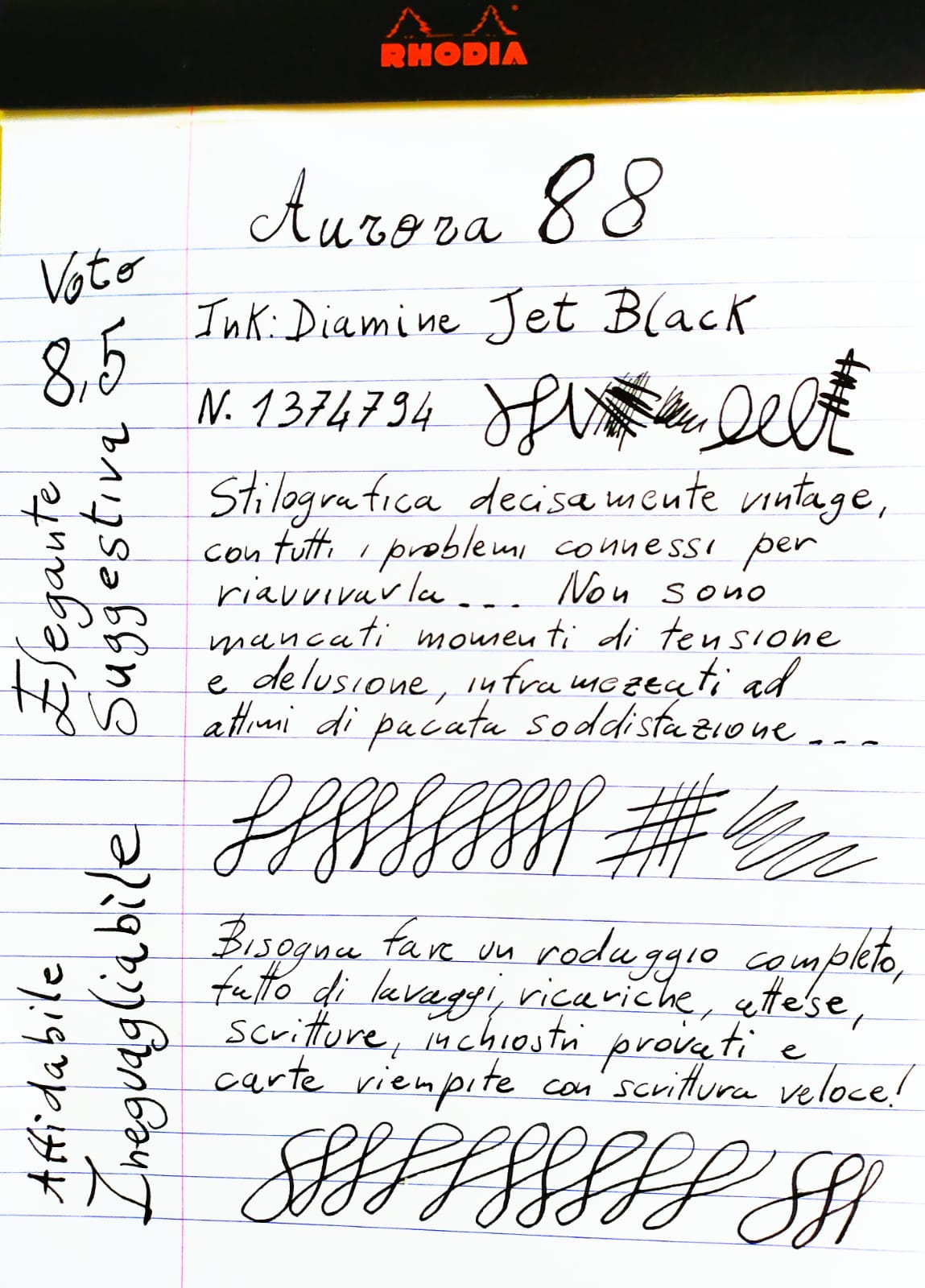 L’Aurora 88, fin da subito presenta tutti i problemi possibili che una “vintage” potrebbe avere. Non ricarica, sembra che non sfiati, non carica l’acqua, non carica l’inchiostro. All’inizio ha scritto, ma ogni volta che la chiudo con il suo cappuccio e dopo qualche minuto la riprendo per scrivere, stenta, devo aspettare, sbatterla all’aria, aspettare che l’inchiostro scenda. Osservandola contro luce, sembra che il serbatoio sia vuoto. Leggendo sui vari forum, mi rendo conto che smontarla, quello che è per tanti una passeggiata, per me potrebbe rivelarsi un dramma. Più leggo sull’argomento, più strade si aprono e tutte sono complesse o lasciano poche speranze alla mia banale incompetenza. Tento la penultima strada percorribile. L’ultima sarebbe affidarmi a santa Rita, ma preferisco tenermela come "ultima spiaggia" e mantenere sacra la sua immagine. Mi decido, così, a svuotarla dell’inchiostro e a fare un ulteriore lavaggio. Utilizzo il pistone caricando e scaricando acqua, alla fine mi accorgo che, tra bollicine d’aria e macchie d’inchiostro, il pistone comincia ad aspirare i liquidi. Mi sento vicino al traguardo, una volta asciutta carico la mia “Aurora 88” con un Diamine Jet Black, così, tanto per provare.