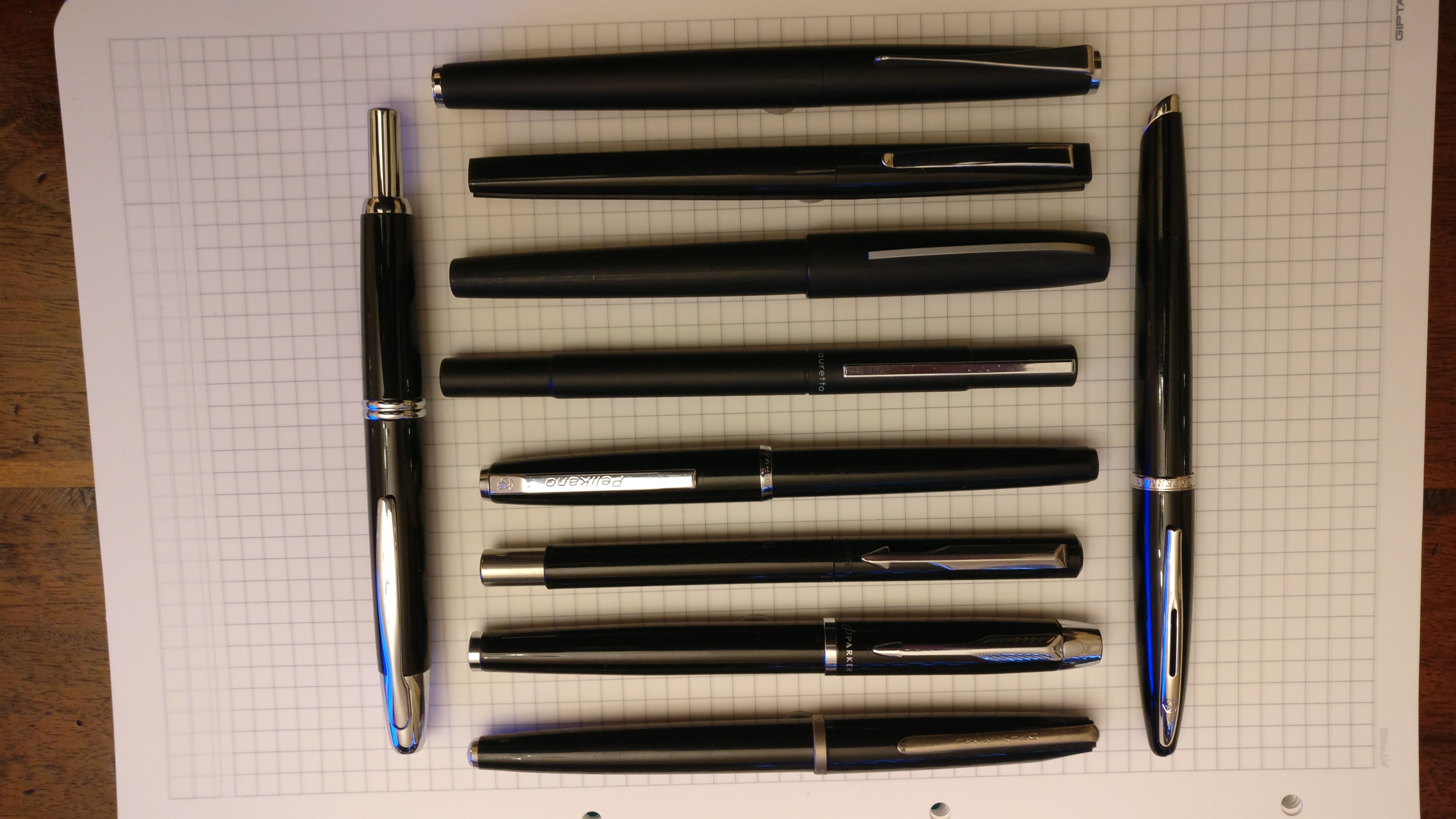 Dall'alto: Universal scolastica (clip e veretta da lucidare), Parker IM, Parker Vector, Pelikano 465, Auretta, Kaco Edge pennino EF, Waterman Jif e Lamy Studio (from Ottorino).