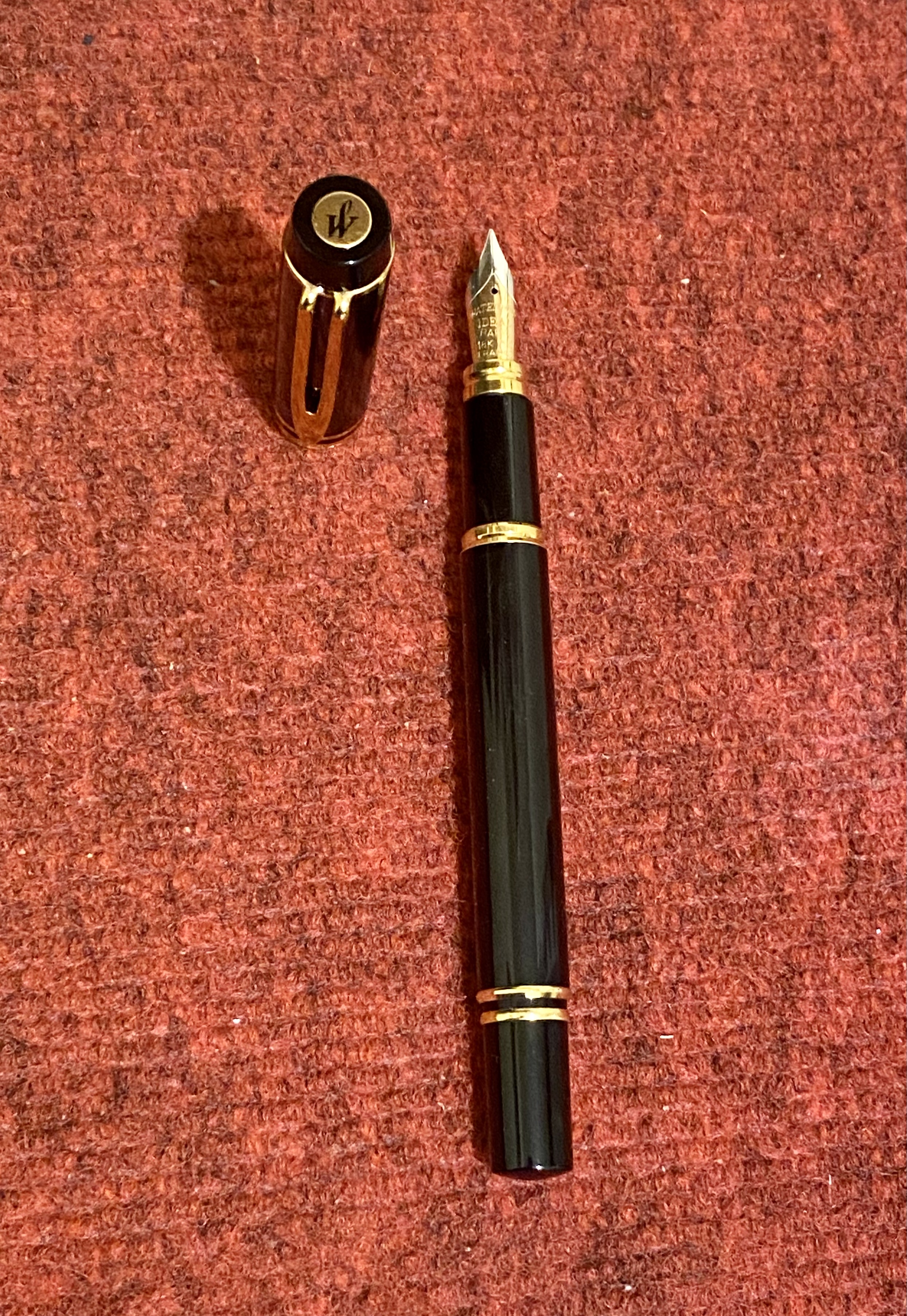 La Man 100 fu introdotta come modello di punta del marchio ed era un penna di taglia grande, lunga 14.4cm e con un bel pennino grande in oro 18K. La Man 100 fu declinata in varie versioni e materiali, tra queste vi è la Patrician; una Man 100 che faceva il verso alla vecchia Waterman Patrician introdotta nel 1929, a cui si rifà con le sue colorazioni più vivaci e l’anello sulla base del cappuccio. La Waterman Man 100 Patrician fu una edizione speciale introdotta nel 1992, inizialmente in due colori, il Corlal Red e la Emerald Green, successivamente affiancata dalla meravigliosa Lapis Blue. Quella argomento di questa piccola recensione è la Coral Red. A differenza della sua antenata in celluloide, la Patrician moderna è una sostanziosa penna in ottone dalla realizzazione solida, laccata con 19 strati applicati nell’arco di due settimane. Il pennino in oro 18K, insieme alla clip e l’anello del cappuccio placcati in oro 24 K, erano prodotti nello stabilimento Waterman di Nantes. Il cappuccio della Patrician è a pressione e calza perfettamente sul fusto con un bel “clic”, tuttavia diventa una penna davvero enorme sbilanciandosi leggermente verso l’indietro. Ecco qualche misura