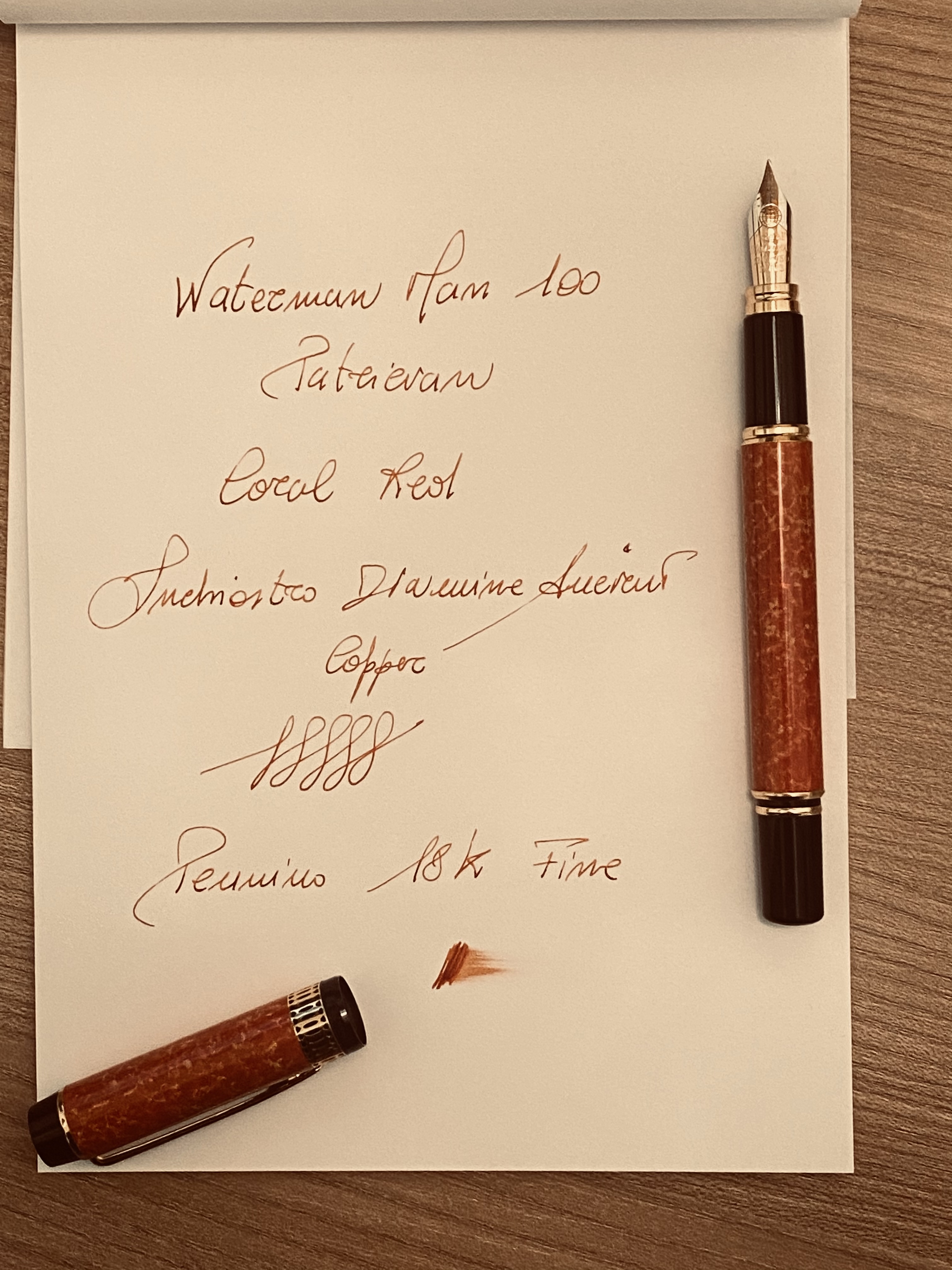 L’esemplare in oggetto era NOS ed ha necessitato di qualche lavaggio approfondito e un paio di ricariche prima di iniziare a fare il suo lavoro come si deve. Il gruppo di scrittura di questa penna non è eccessivamente generoso nel flusso, direi che è molto ben controllato ma non perde un colpo. Il tratto è  un fine tutto sommato coerente alla gradazione dichiarata. Il pennino non è flessibile, ma piacevolmente morbido e scorre con un feedback appena avvertibile solo sulle carte più rugose, credo principalmente a causa al flusso non abbondante. C’è comunque da dire che gli inchiostri che ho usato finora, i Diamine Terracotta e Ancient Copper, benché non siano inchiostri difficili o problematici,  non sono comunque particolarmente lubrificanti.