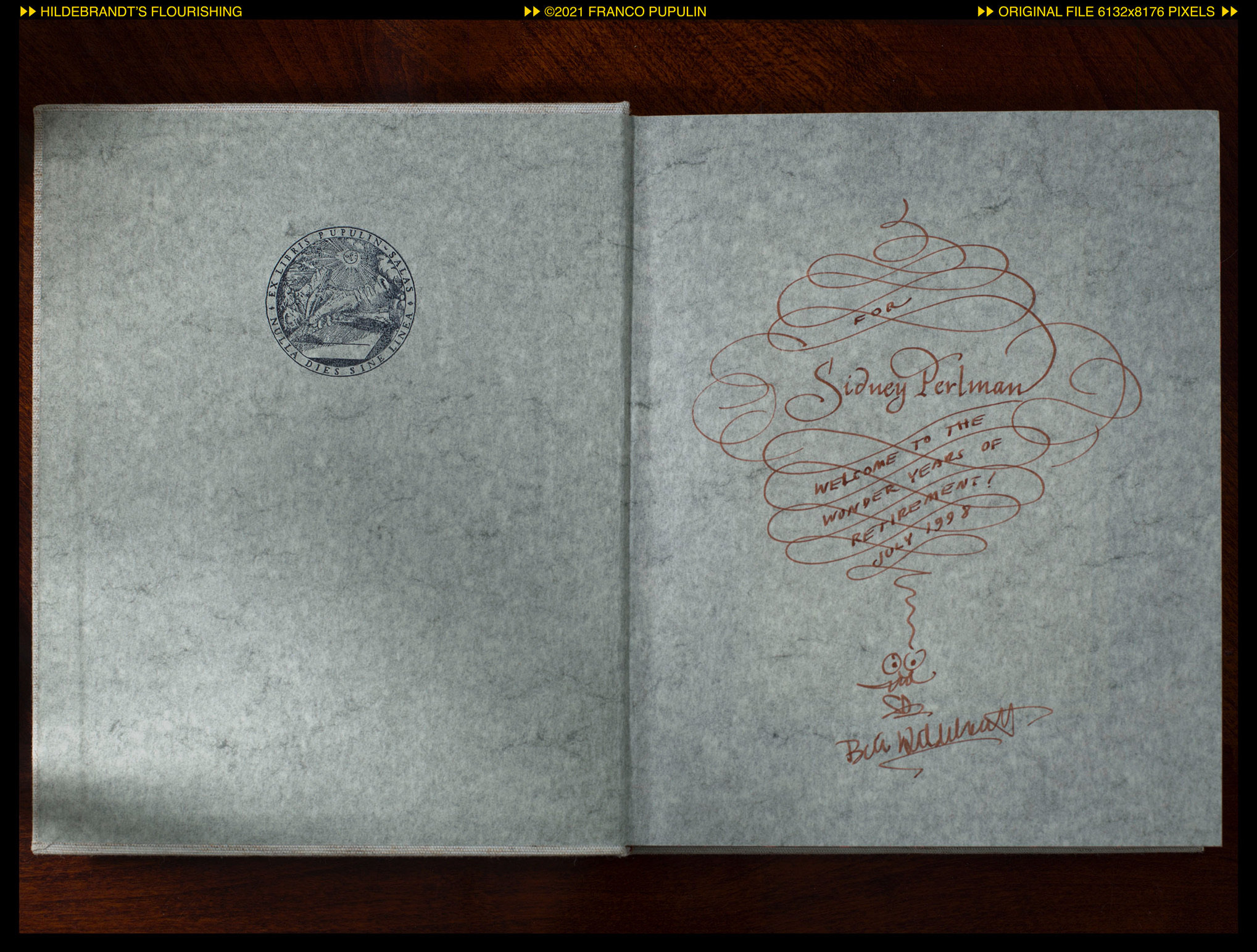 All’interno, sulla pagina destra del risguardo, si trova la dedica di Hildebrandt. Come avevo immaginato, è fiorita ed è bellissima. Sidney Perlman, cui il libro fu dedicato dall’autore, deve certamente aver apprezzato il regalo, ma non credo fosse un appassionato di calligrafia. Il libro sembra, infatti, intonso, e dubito che qualcuno ne abbia mai sfogliato le pagine prima di me.