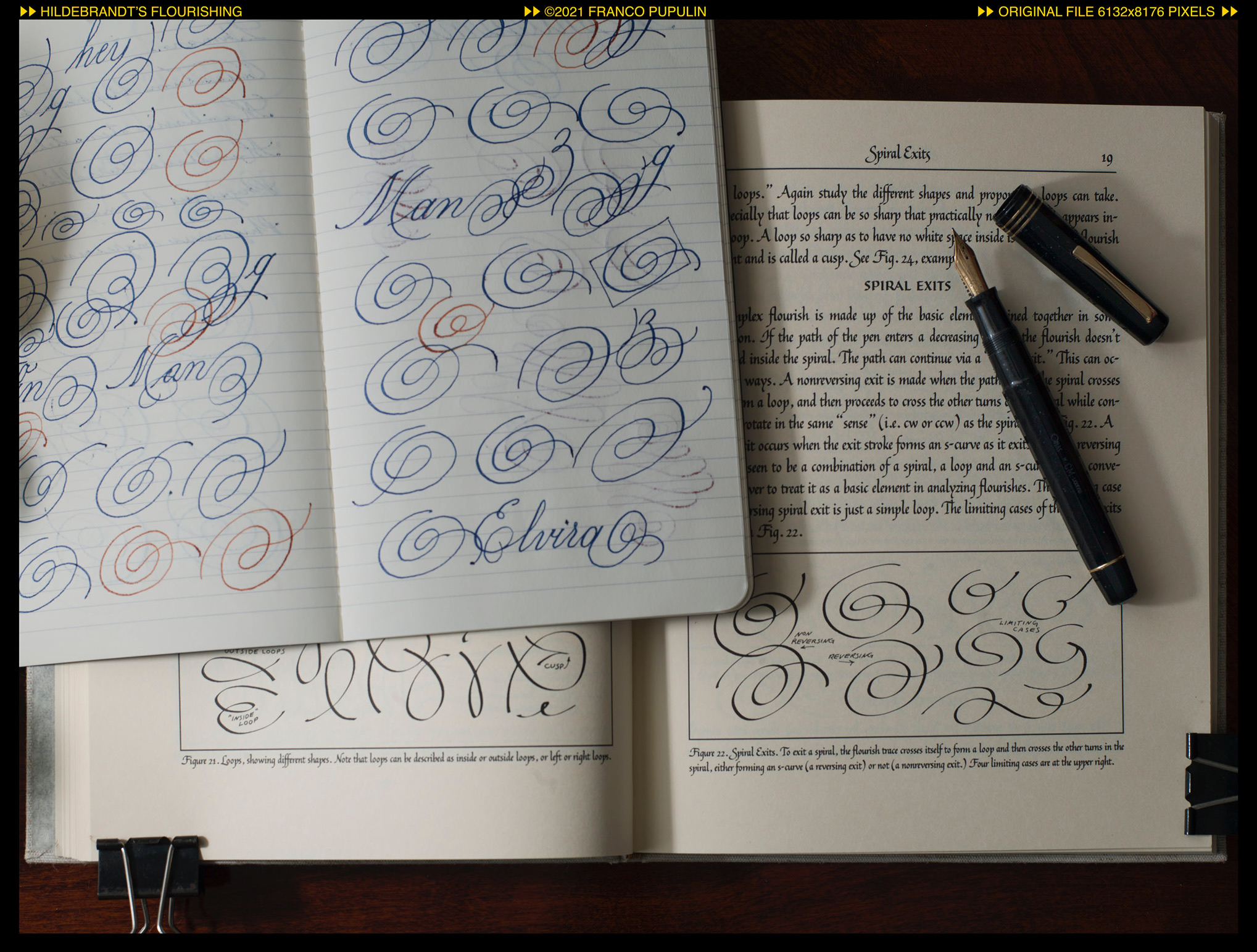 È particolarmente interessante notare che, mentre sono solito associare le fioriture alle grafie “appuntite” come la Copperplate e la Spencerian, il pennino che Hildebrandt utilizza maggiormente nei suoi esempi è invece l’italico, o comunque un pennino tronco.