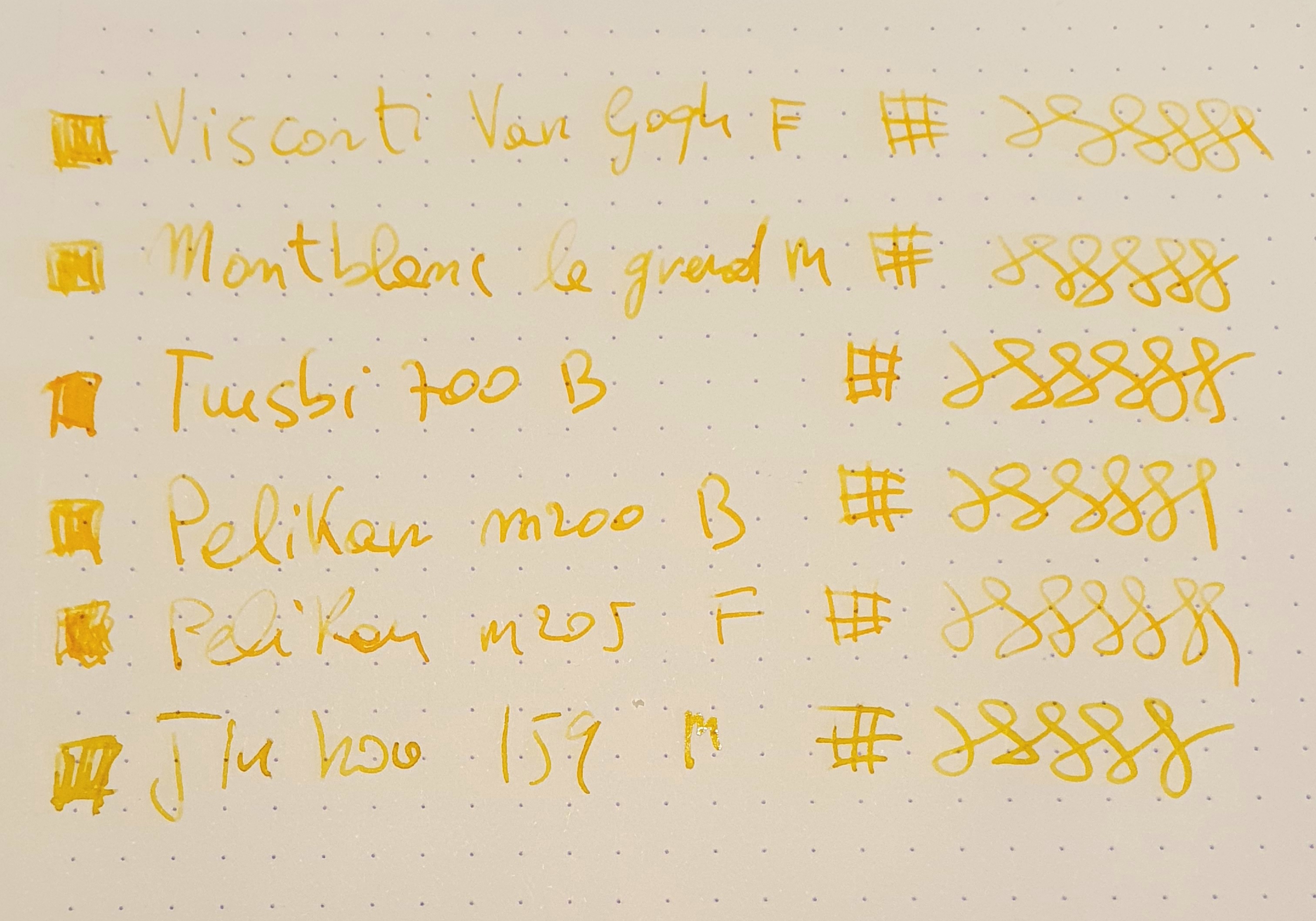 Invece i pochi inchiostri molto chiari, come giallo e grigio chiaro, hanno il problema di essere poco leggibili, e quindi aver bisogno di un pennino non troppo fine.
