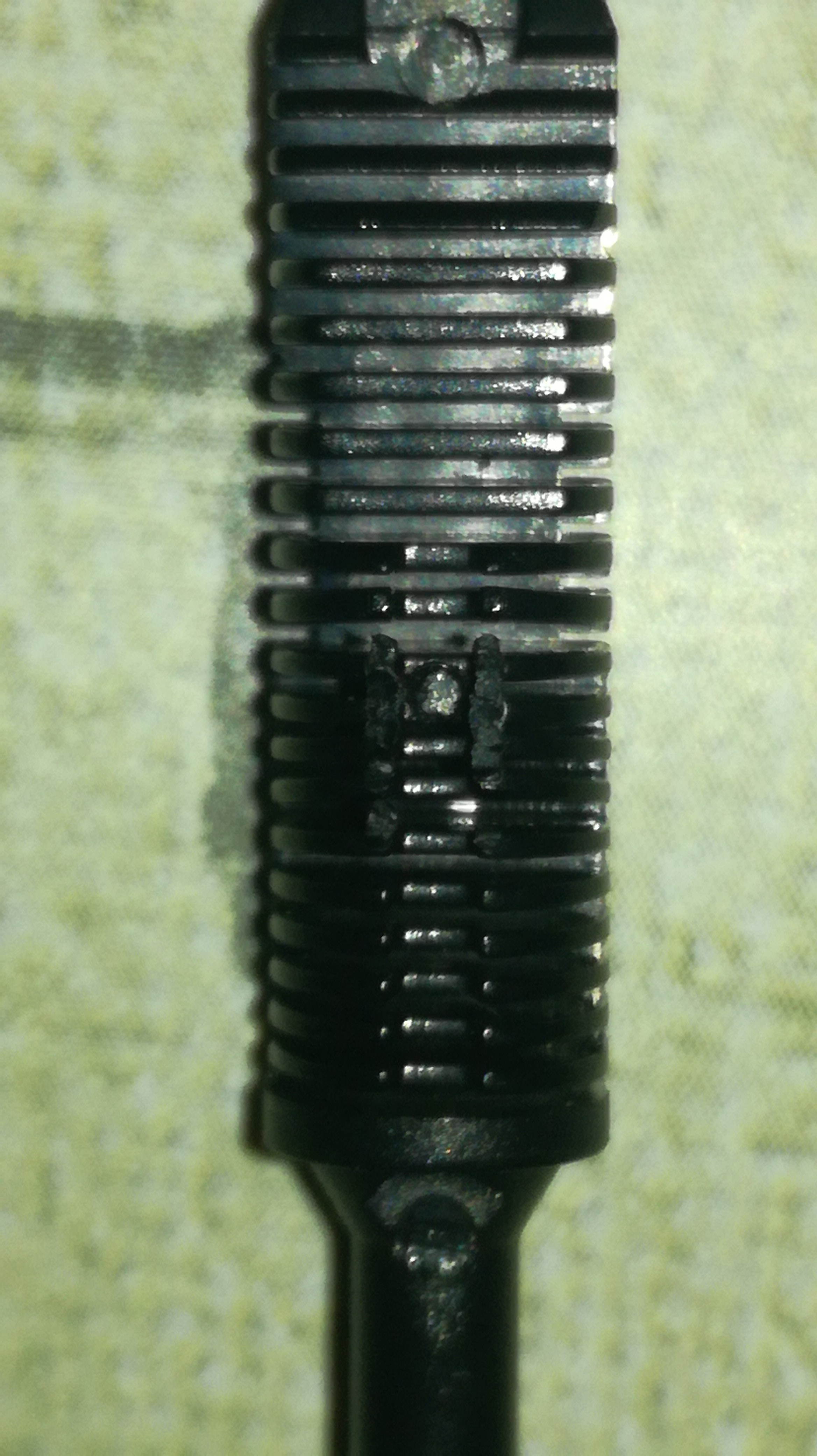 Purtroppo, il primo impatto non è stato dei migliori (e non per il feedback, che ho apprezzato), anzi. La penna scriveva con un tratto sottilissimo, più sottile di quello di una Kakuno F, e con un flusso estremamente scarso. Talmente scarso che a un tratto ha smesso di scrivere completamente, con la cartuccia piena ancora un po' meno della metà. Pensando che il problema fosse qualche residuo di fabbricazione, ho proceduto al lavaggio (l'ho inchiostrata e via, senza lavarla prima) ma il problema si è ripresentato uguale. Terminata la seconda cartuccia, ho provato a cambiare inchiostro passando al Lamy T52 Blue Black ma il problema è rimasto. Ho allora deciso di fare le cose per bene e l'ho smontata, e quello che mi sono trovato davanti è stato questo: Un meraviglioso alimentatore con alcune lamelle piegate e fuse tra loro (non sono dunque stato io a danneggiarle nell'estrazione); in più i rebbi erano talmente stretti che attraverso passava pochissima luce (purtroppo non ho foto decenti).