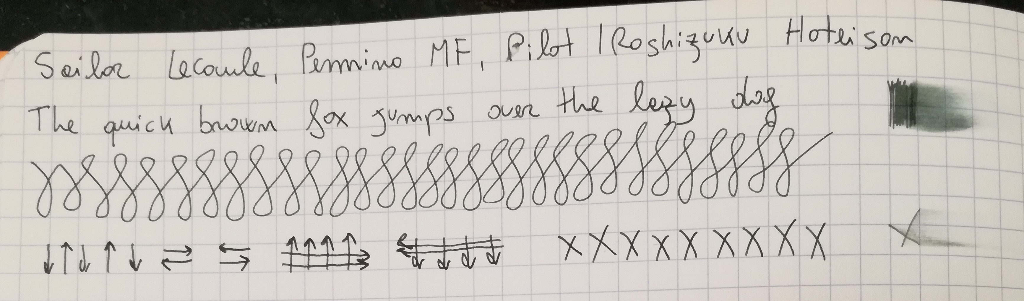 La Lecoule adesso scrive con un buon flusso e mantenendo il suo feedback deciso ma comunque senza in alcun modo grattare. La dimensione del tratto è un tantino tantino troppo sottile per un MF, dato che è più sottile della Kakuno F, e il flusso leggermente meno abbondante, ma sono comunque molto soddisfatto di come scrive adesso. L'unica cosa è che dopo sessioni molto lunghe il flusso diminuisce leggermente, pur senza avere incertezze e salti, ma questo forse lo imputerei più alla carta che normalmente uso.