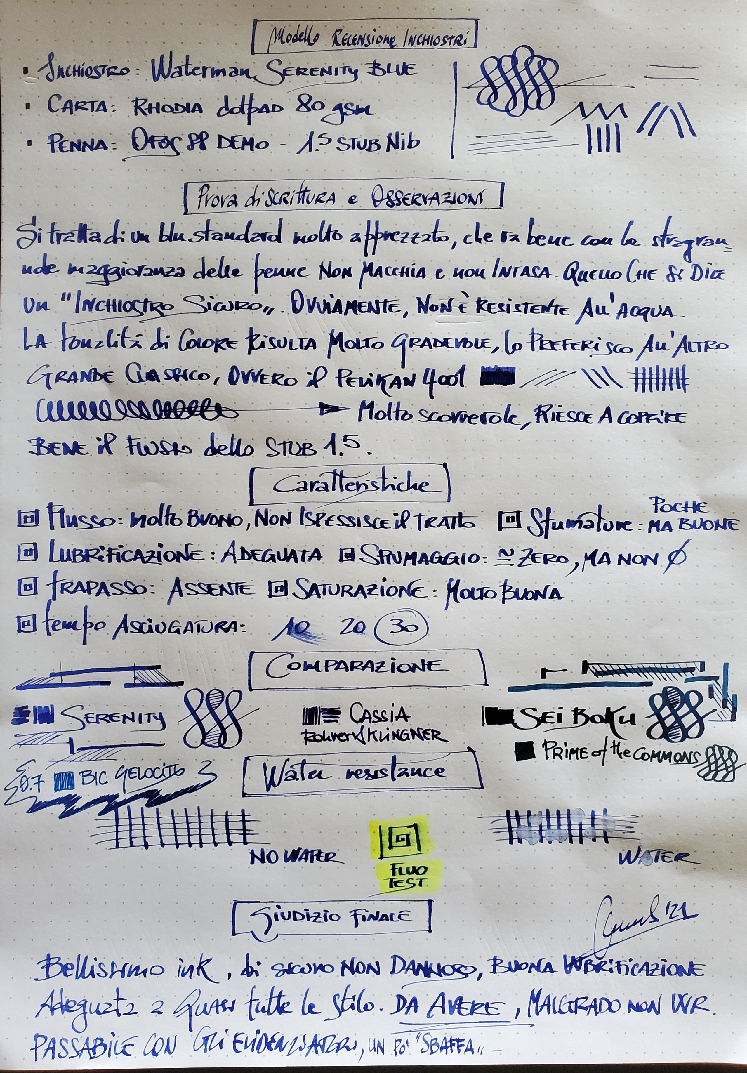 Il Serenity Blue è l'inchiostro ideale per testare le penne nuove. Se con questo va male, nel 95% dei casi il problema è la penna. Su alcune carte dopo un po' di tempo cambia un po' il colore, si "siede" come direbbe Marco Chiari. Non su tutte le carte però. Lo reputo un ottimo inchiostro