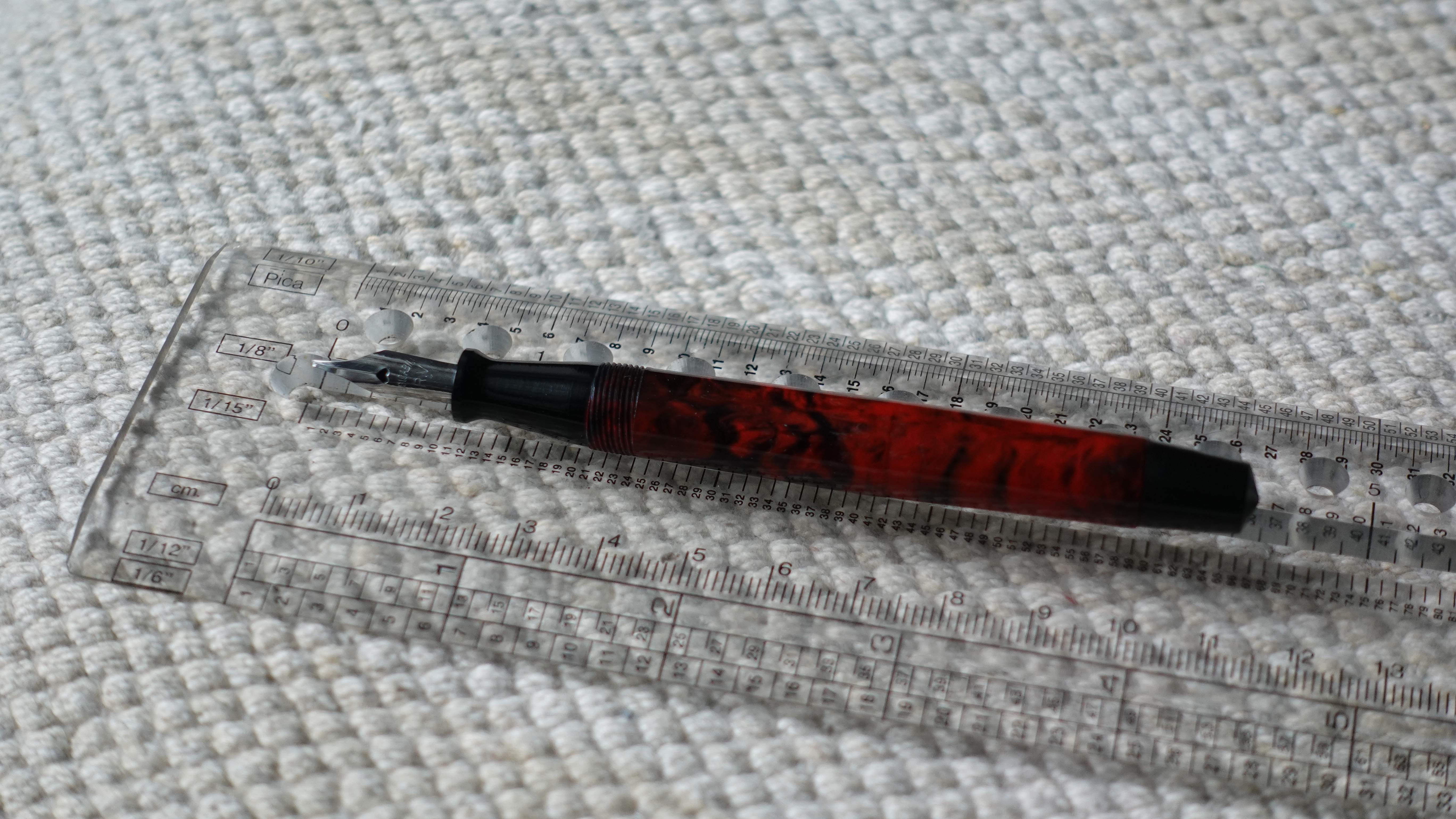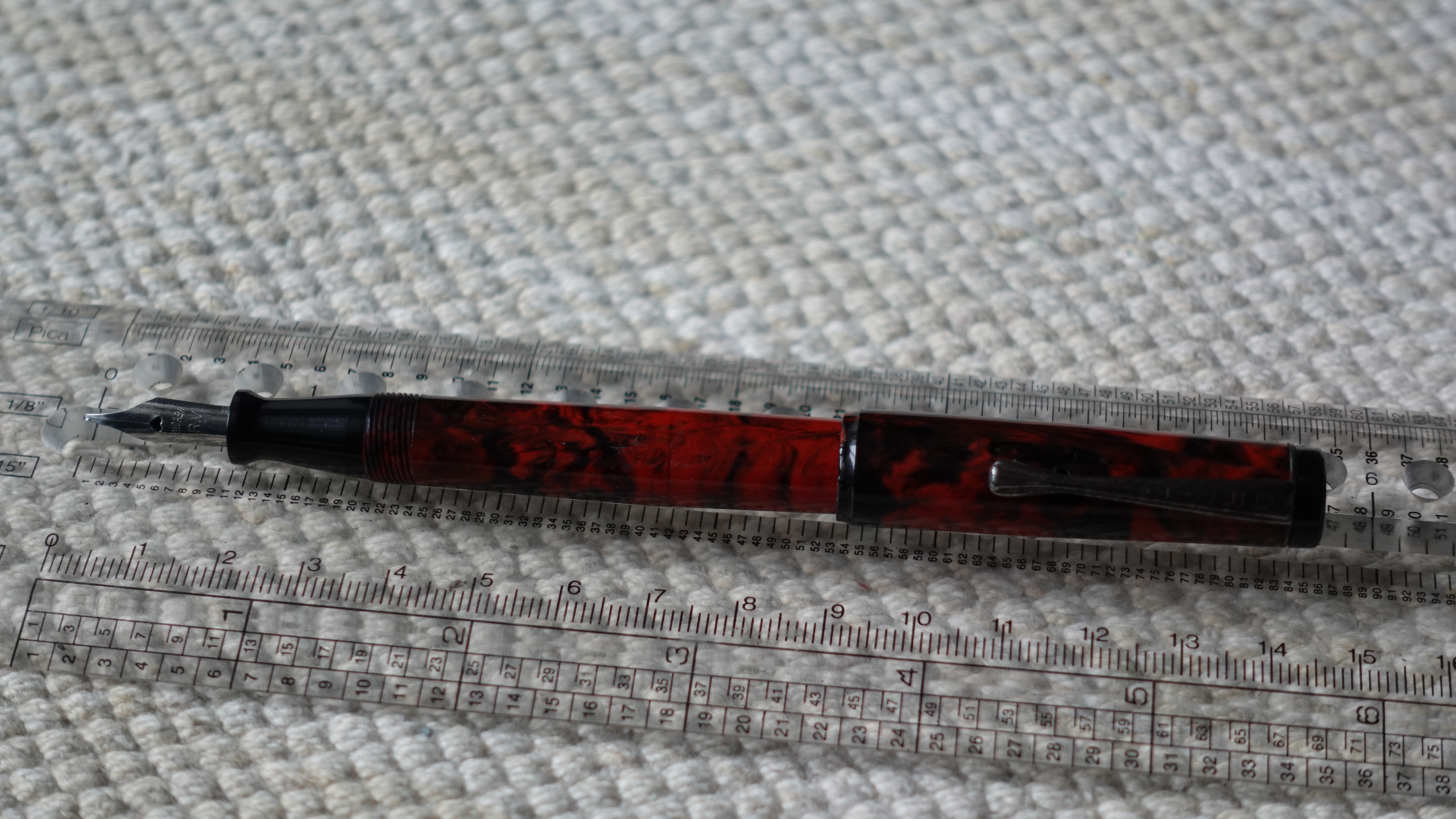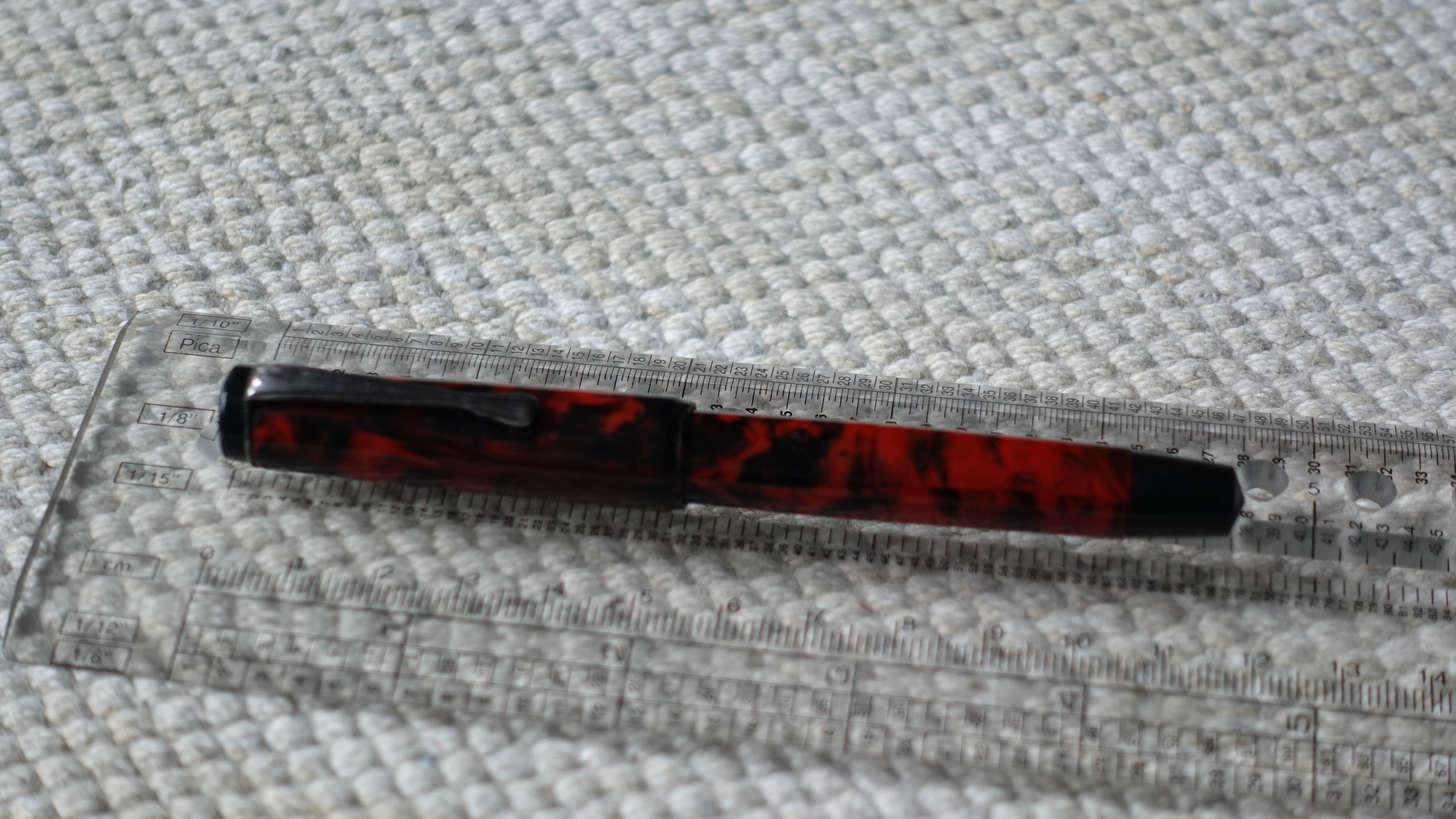 Ma ad occhio non sembra più plastica di altri, e la giunzione che si vede su una foto (non troppo bene, mi pare sia a fuoco il righello più che la penna) è normale nelle penne in celluloide fatte da una lastra sottile.