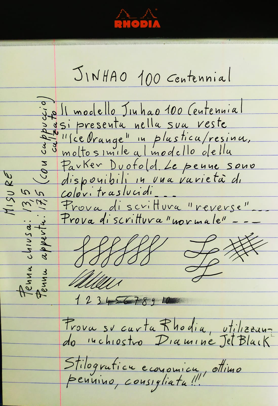 Il modello Jinaho 100 Centennial Ice Orange si presenta come una penna stilografica in plastica/resina, molto simile al modello iconico della Parker Duofold. Le penne sono disponibili in una varietà di colori traslucidi, vengono spedite con convertitori a pistone rotante installati e si adattano a cartucce internazionali standard. Il converter risulta essere assai approssimativo ed economico. Consiglio di sostituirlo appena possibile con qualcosa di più affidabile (estremamente consigliato). Il cappuccio si adatta saldamente e s’inserisce a vite, ma sia il cappuccio che il fusto danno l’dea che possano rompersi con il tempo e l'uso. La clip è robusta e tiene bene: al centro, in cima, in una specie di scudetto è impresso il logo di Jinhao: due figure su un calesse con cavallo. Le clip a sfera è comune e non associata a nessuna marca particolare. Nella veste “Ice Orange” assume i tratti estetici del fusto della “Delta Dolce Vita” senza però tentare di imitarla.