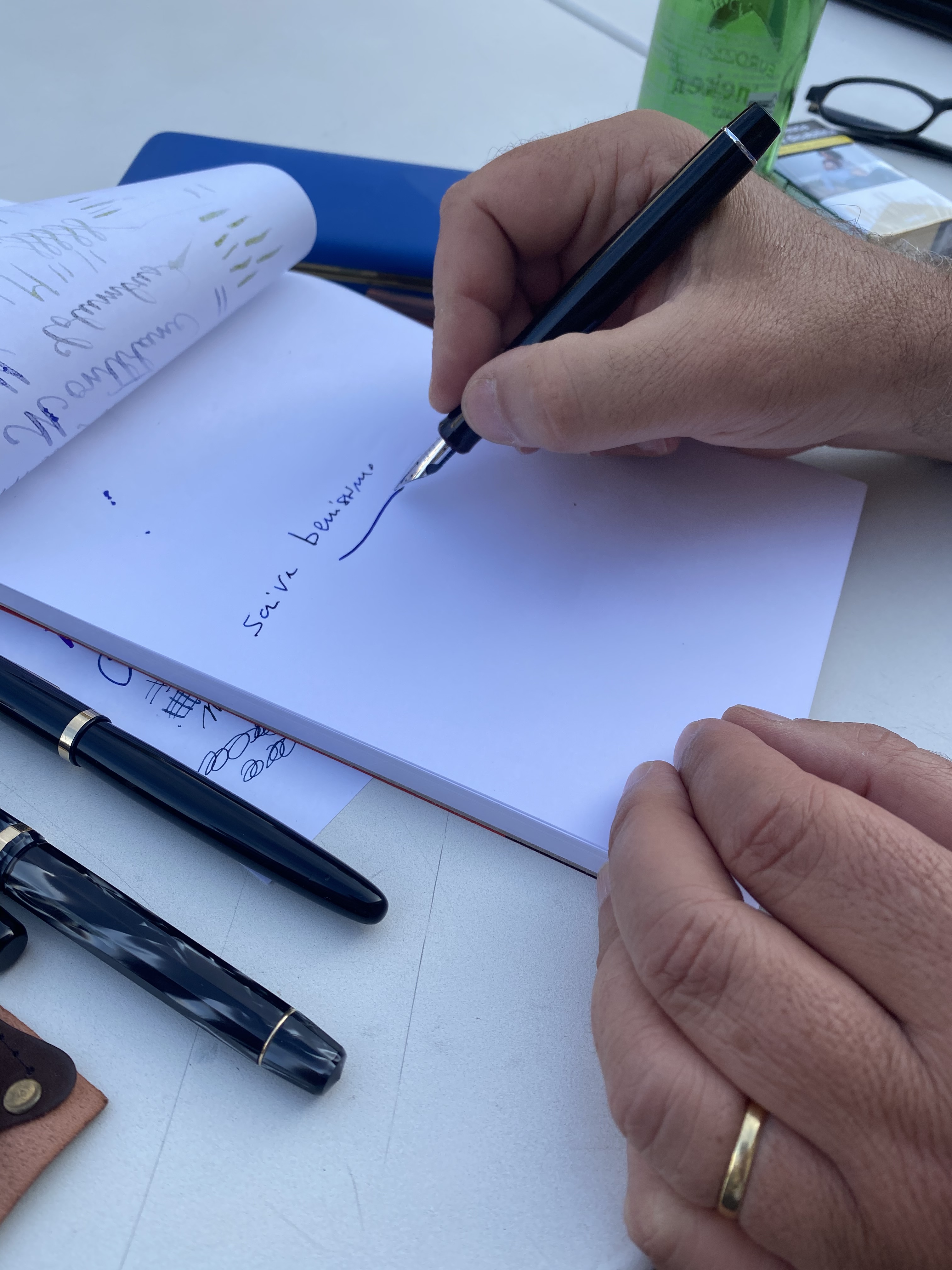 Un incontro dedicato al pennino flessibile ma non ci siamo fatti mancare nulla. Tra i flessibili una piccola Columbus portata da Alecol rinvenuta ad un mercatino, ha dato filo da torcere a penne ben più blasonate. Tra i moderni un pennino Pilot FA e il Calligrahy si sono sicuramente distinti, ma credo che la star sia stata una OMAS Lucens taglia media, penna che tuttavia si presenterebbe poco pratica per un uso quotidiano.