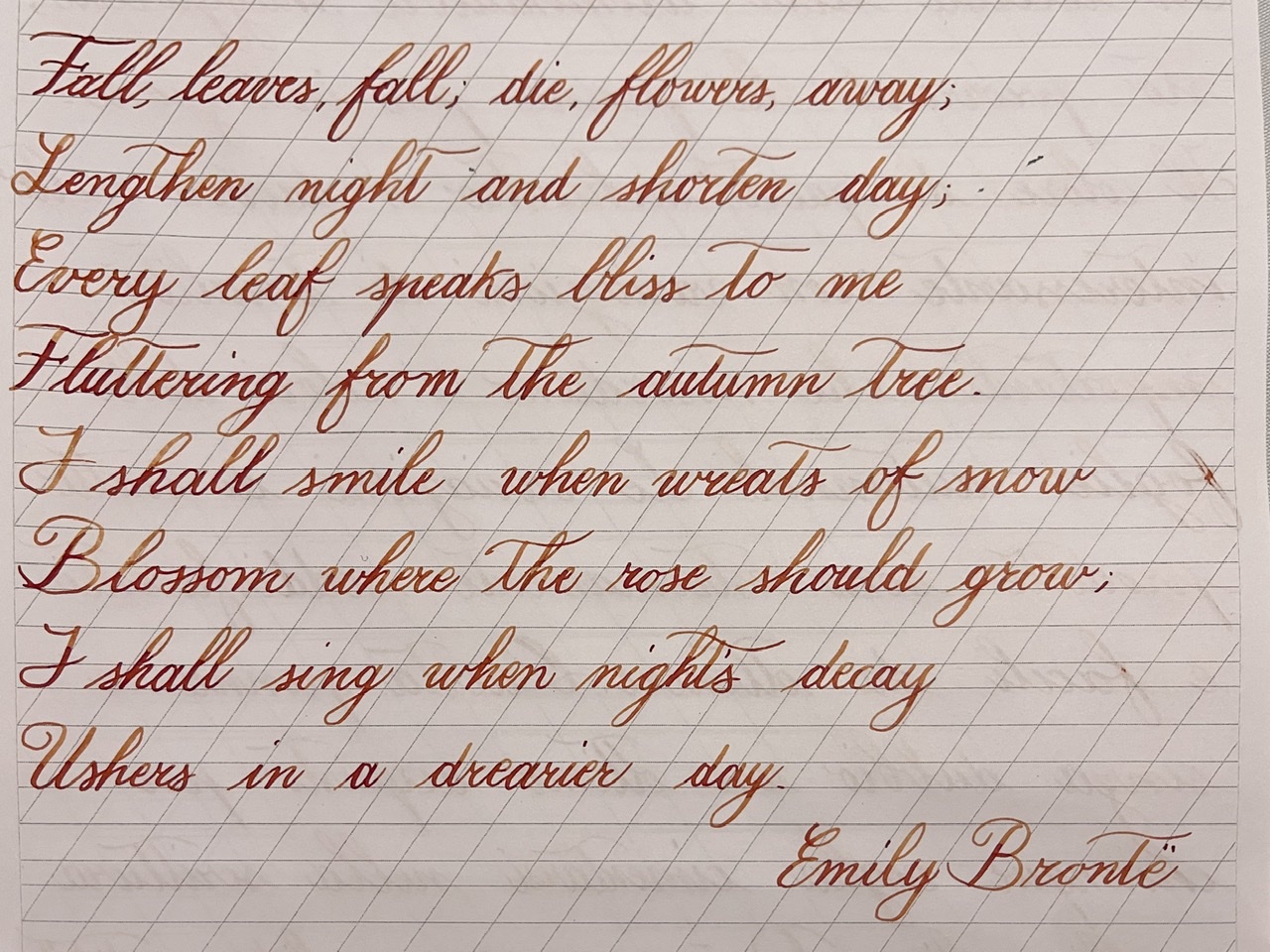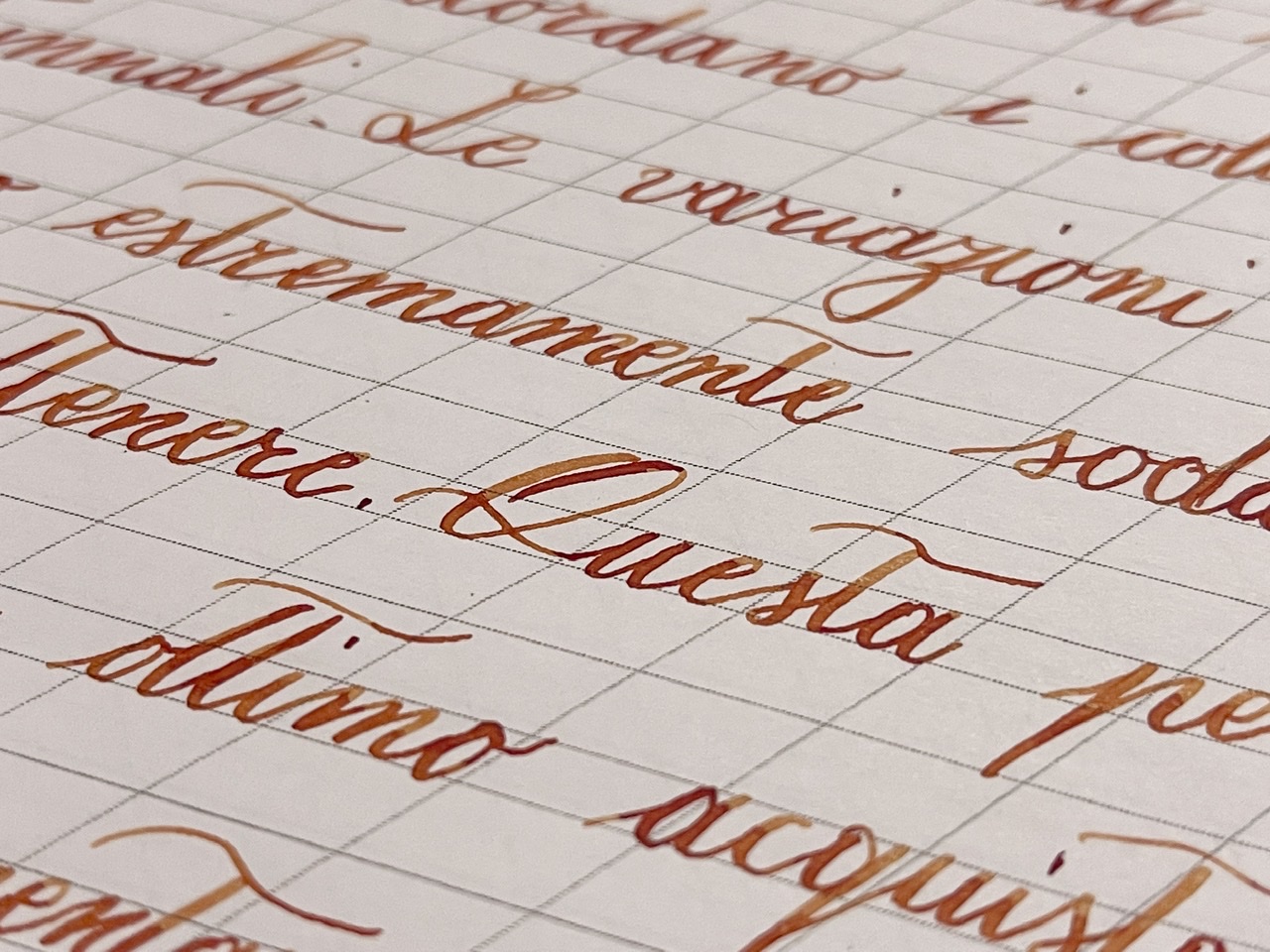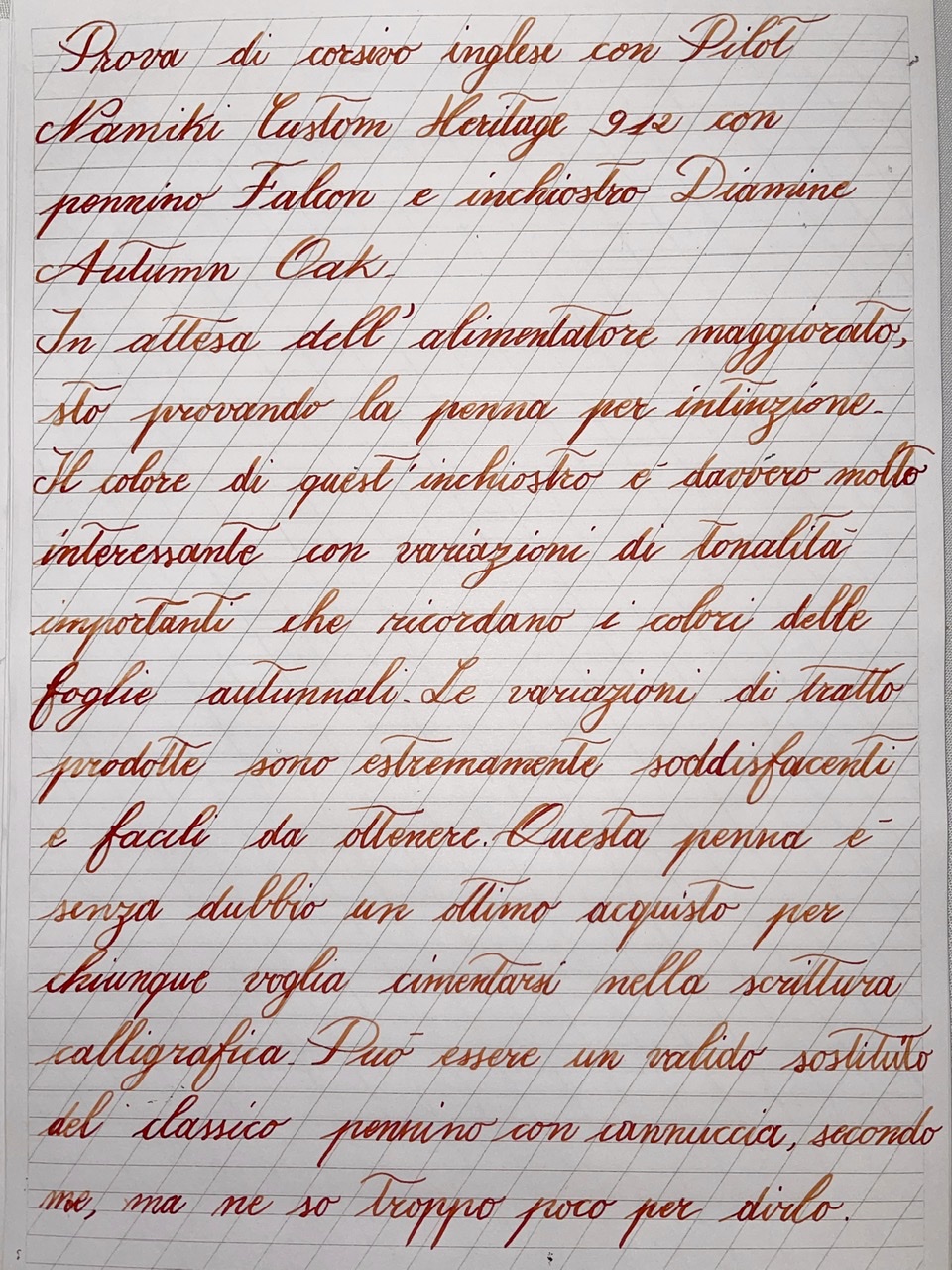 Grazie e complimenti ancora!Non so cosa vorresti sapere, il modello della penna è Custom Heritage 912 con il pennino Falcon (FA), l’inchiostro è Diamine Autumn Oak.