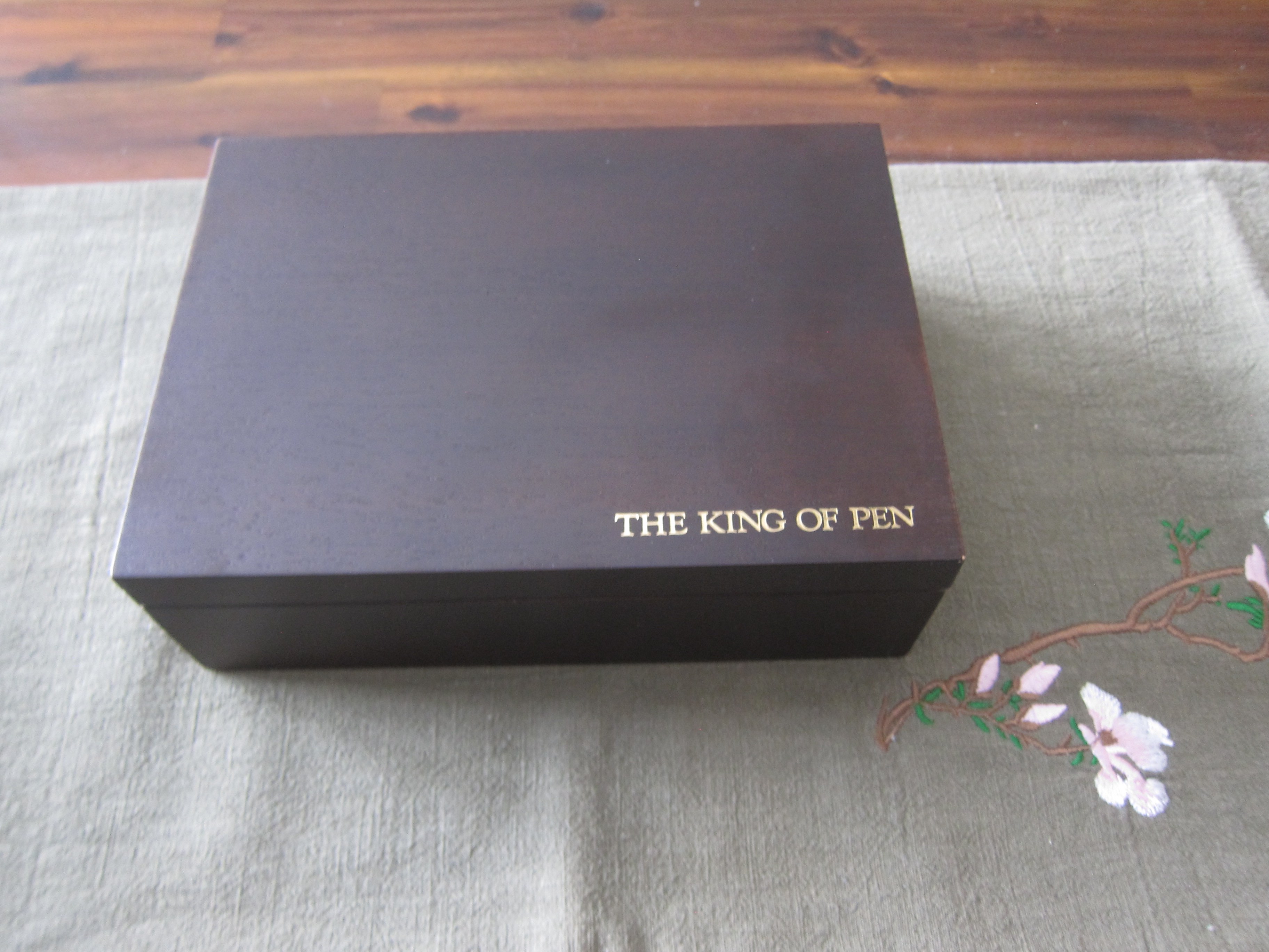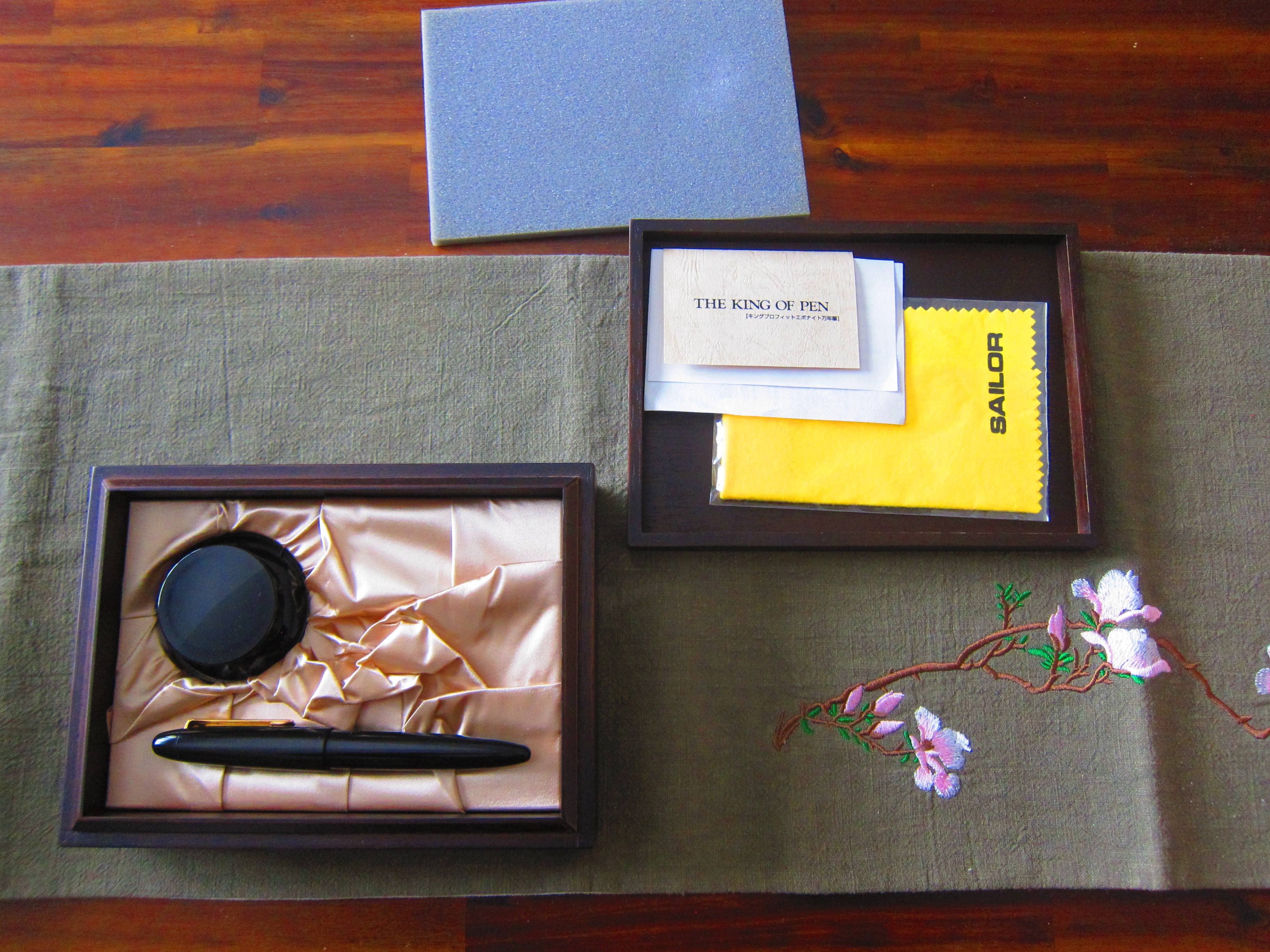La penna e’ arrivata in una scatola in legno che contiene anche una boccetta di inchiostro Sailor nero , un panno per la lucidatura e un po’ di carte varie.