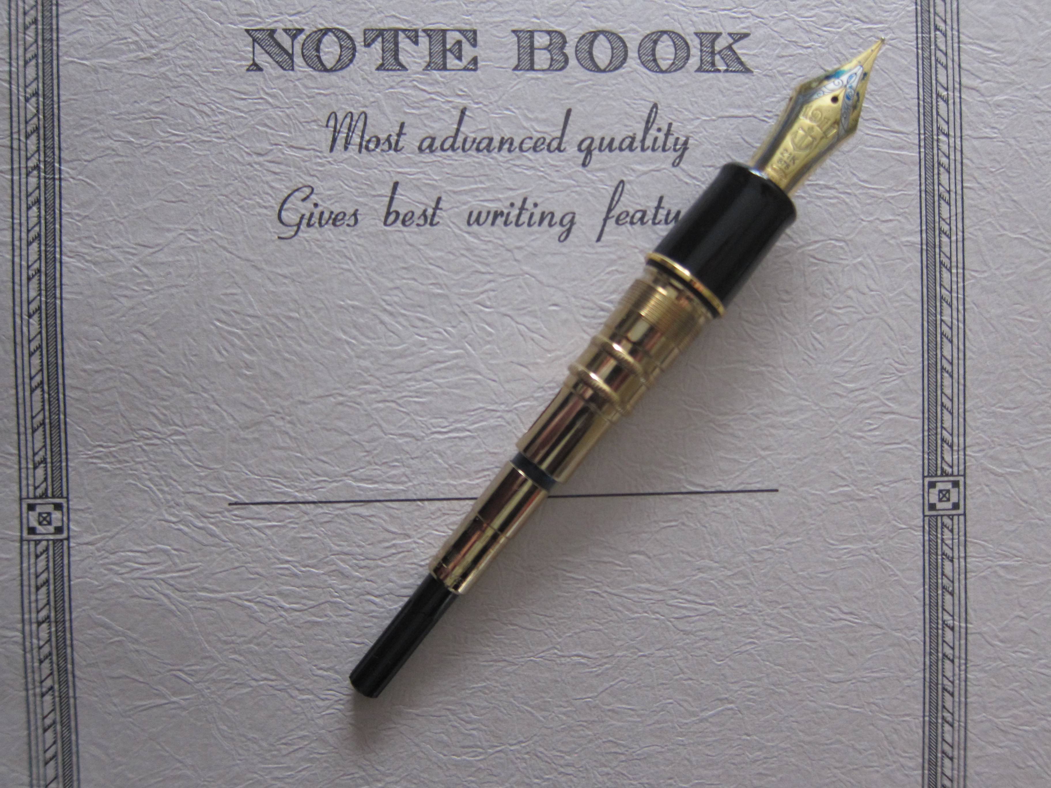 Il corpo e il cappuccio sono in ebanite nera mentre la sezione e l’alimentatore sono in plastica. La chiusura del cappuccio e’ a vite. Nonostante le dimensioni non indifferenti (simili alla MB 149), la penna e’ leggera. Il design e’ semplice e minimalista, poco appariscente direi, e il vero protagonista e’ il pennino.
