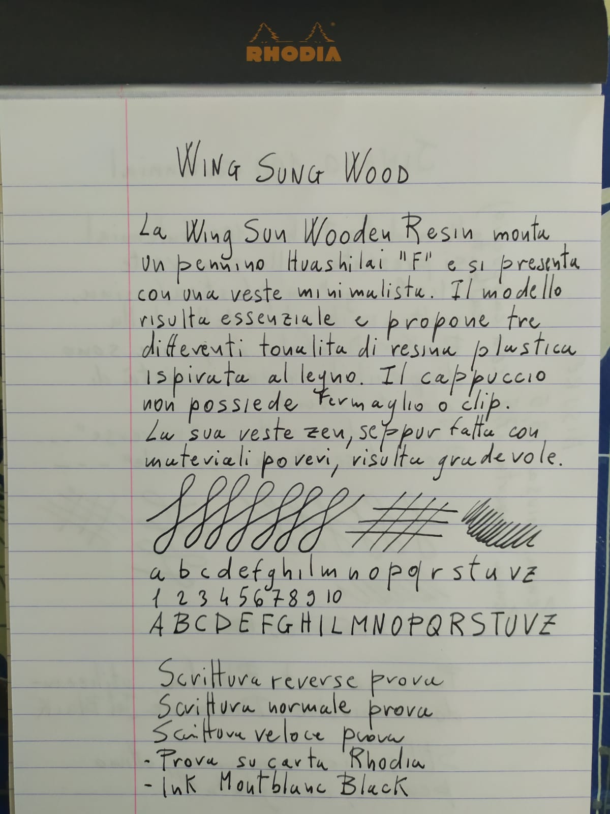 Il modello Wing Sung Wood si presenta come una penna stilografica in “woodland resin” (resina in plastica che imita il legno), dallo stile minimalista ed essenziale, che ricorda molto una visione zen delle cose. Le penne sono disponibili in tre possibili colori, ognuno in procinto di imitare i vari tipi di legno. La stilografica scelta è di colore nero e monta un pennino Huashilai, vengono spedite insieme a un gradevole sacchetto di panno nero e si adattano a converter/cartucce internazionali standard.