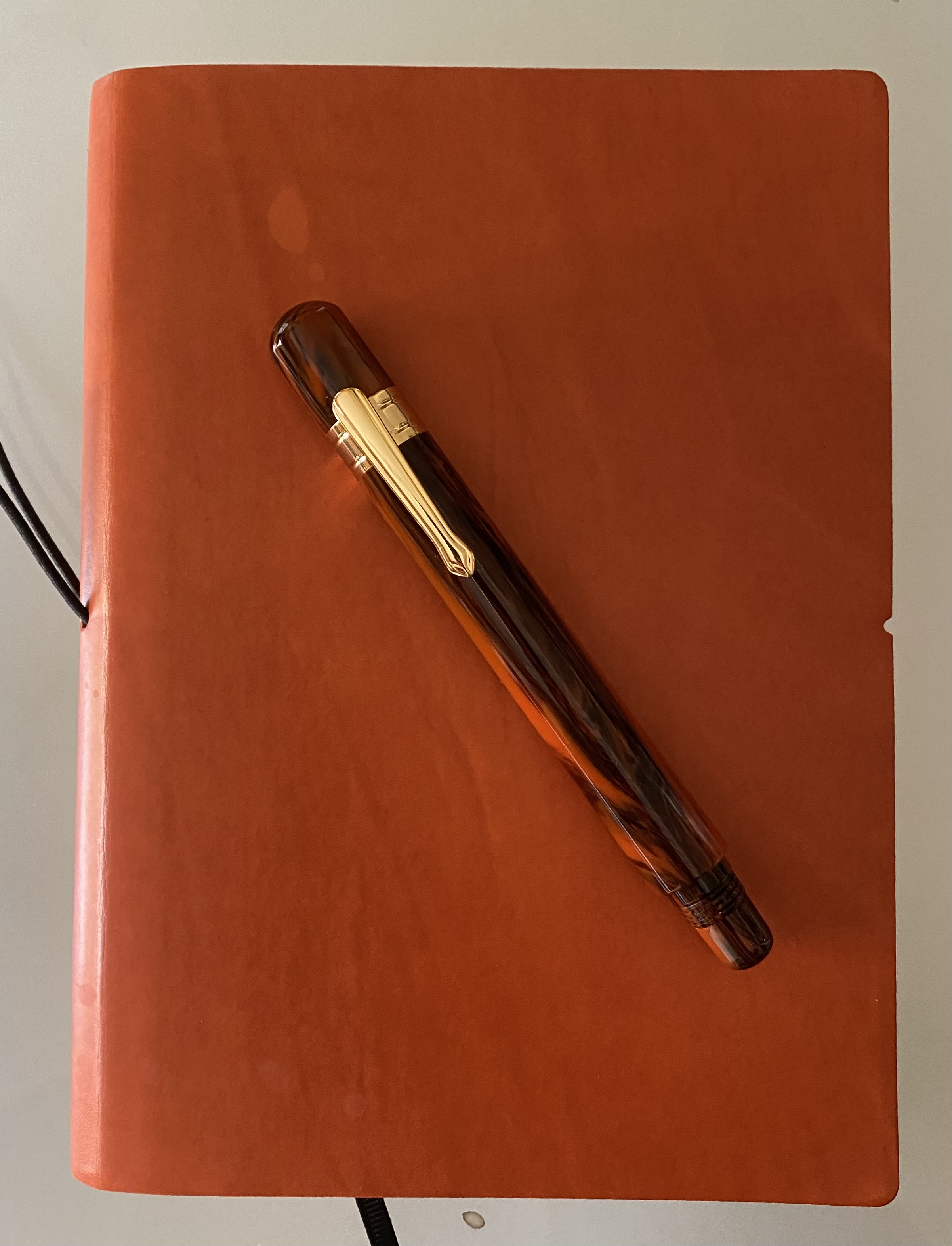 Taccia Covenant, una penna di origine giapponese (credo, anche se non ho capito se parte della produzione non stia in America) con livrea che ricorda l’ebanite “mottled’ di una volta e l’aria vagamente Decó... La penna ha uno stile veramente particolare con il cappuccio che copre praticamente tutta la penna.
