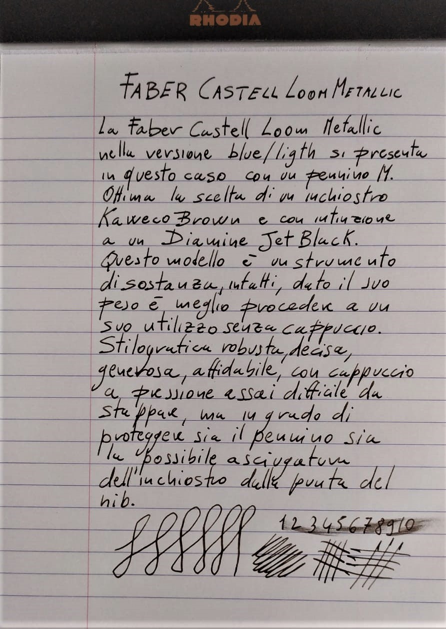 Scrive M. D. F.: “La Faber-Castell Loom ha pennini impeccabili, fluidi ma non privi di un gradevole feedback; si inchiostrano bene, senza bagnare il foglio. Mai una falsa partenza.”