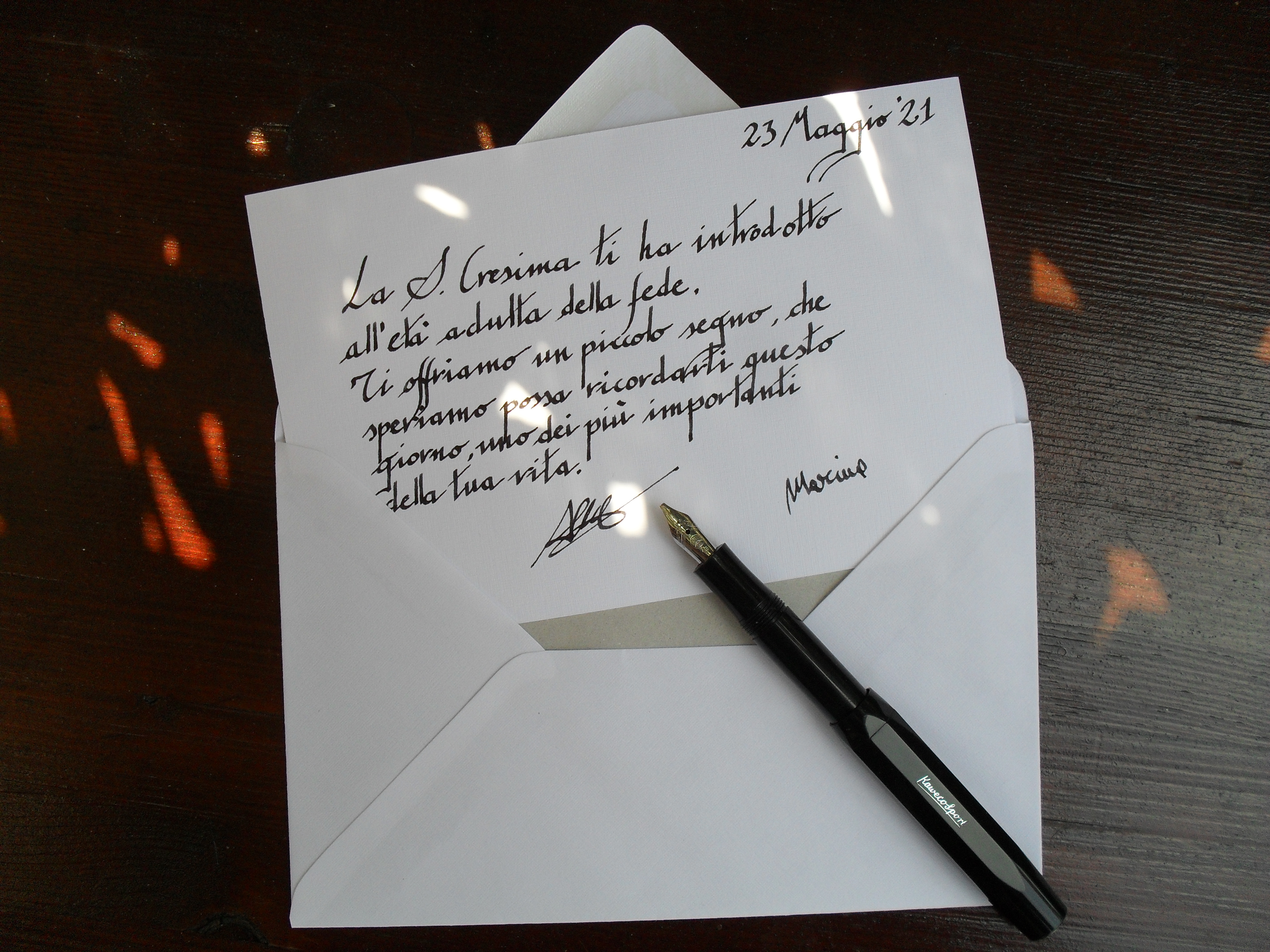 L’inchiostro è il bellissimo (almeno per me) Kaweco “Midnight Blue”, un blu che, a seconda della carta, oscilla fra una sorta di blu aviazione ed il blu nero.