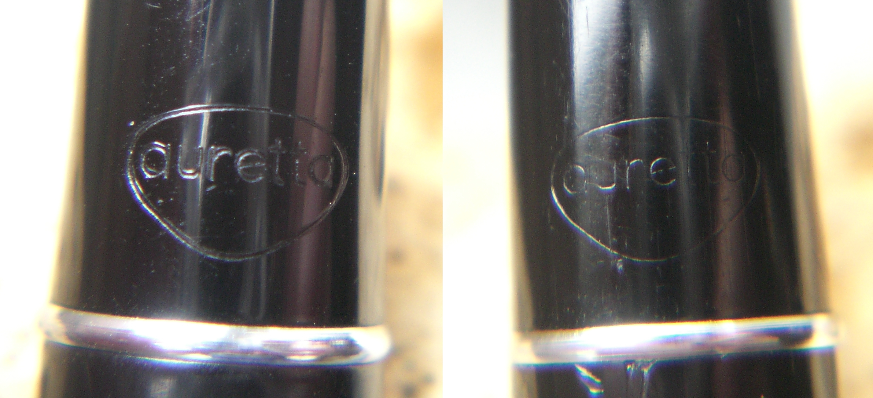 Nella versione con cappuccio di resina il logo è più marcato, mentre in quella con cappuccio metallico è più sottile. La scritta Auretta è incisa anche sul pennino.