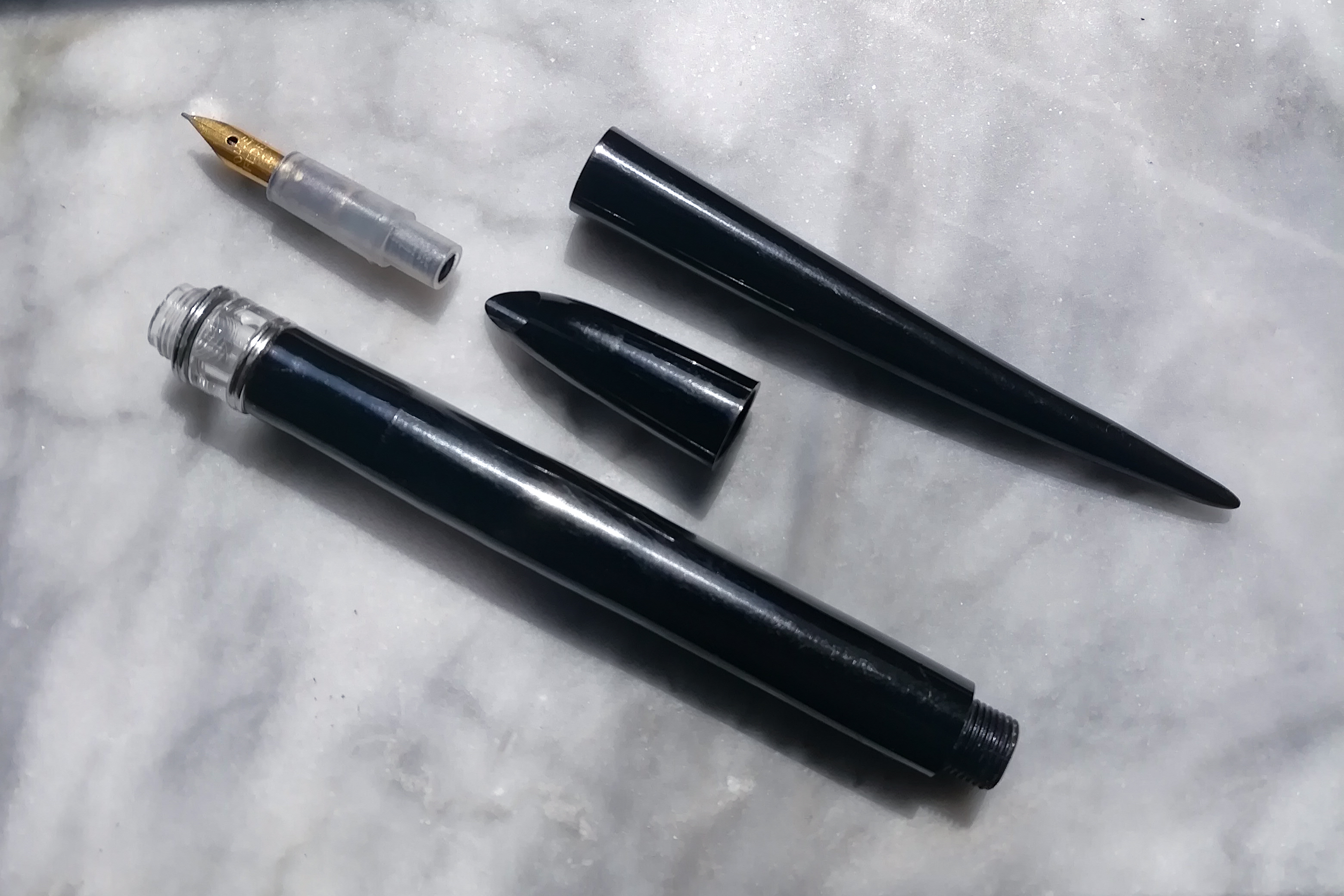 La penna è la classica con converter a siringa e pennino hooded, con punte ripiegate.
