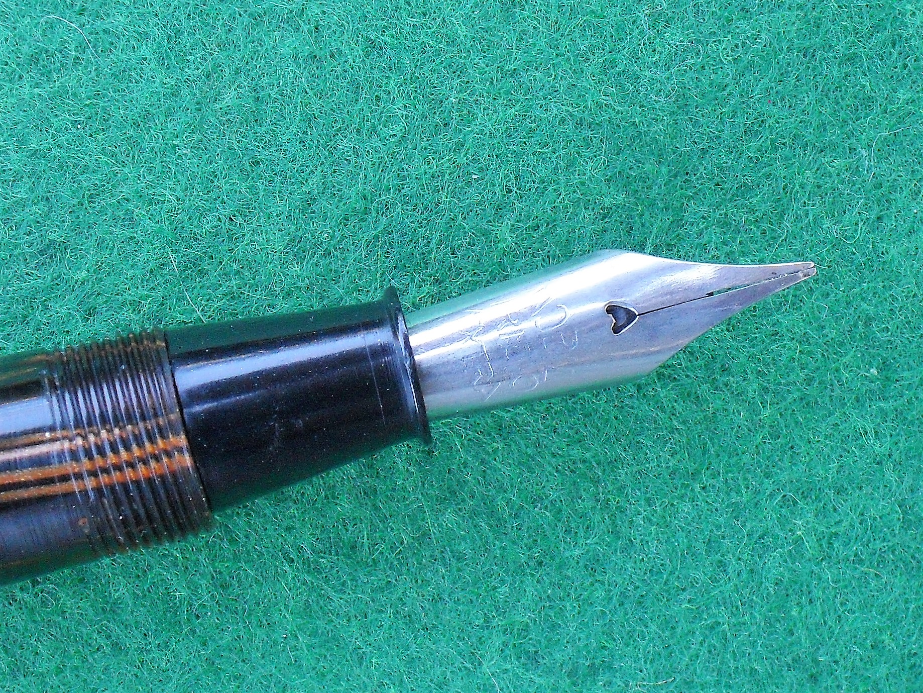 Il pennino, marcato “Nobil iridio extra”, è in acciaio e, provato a secco, si manifesta scorrevole e realmente flessibile. Probabilmente, è frutto d’una sostituzione operata nel corso della seconda guerra mondiale, o della mancanza di metallo nobile tipica degli anni 1940 - 45.