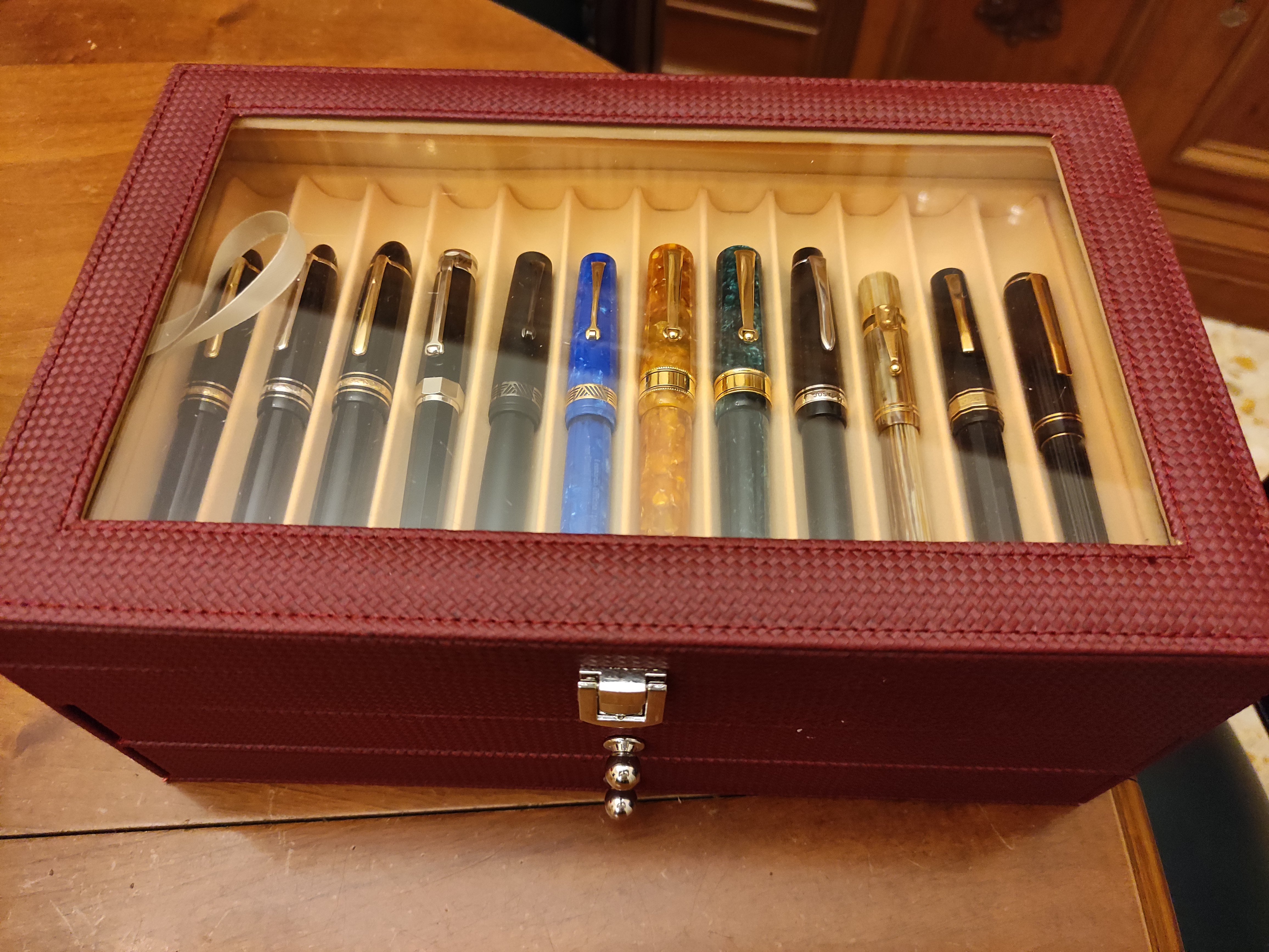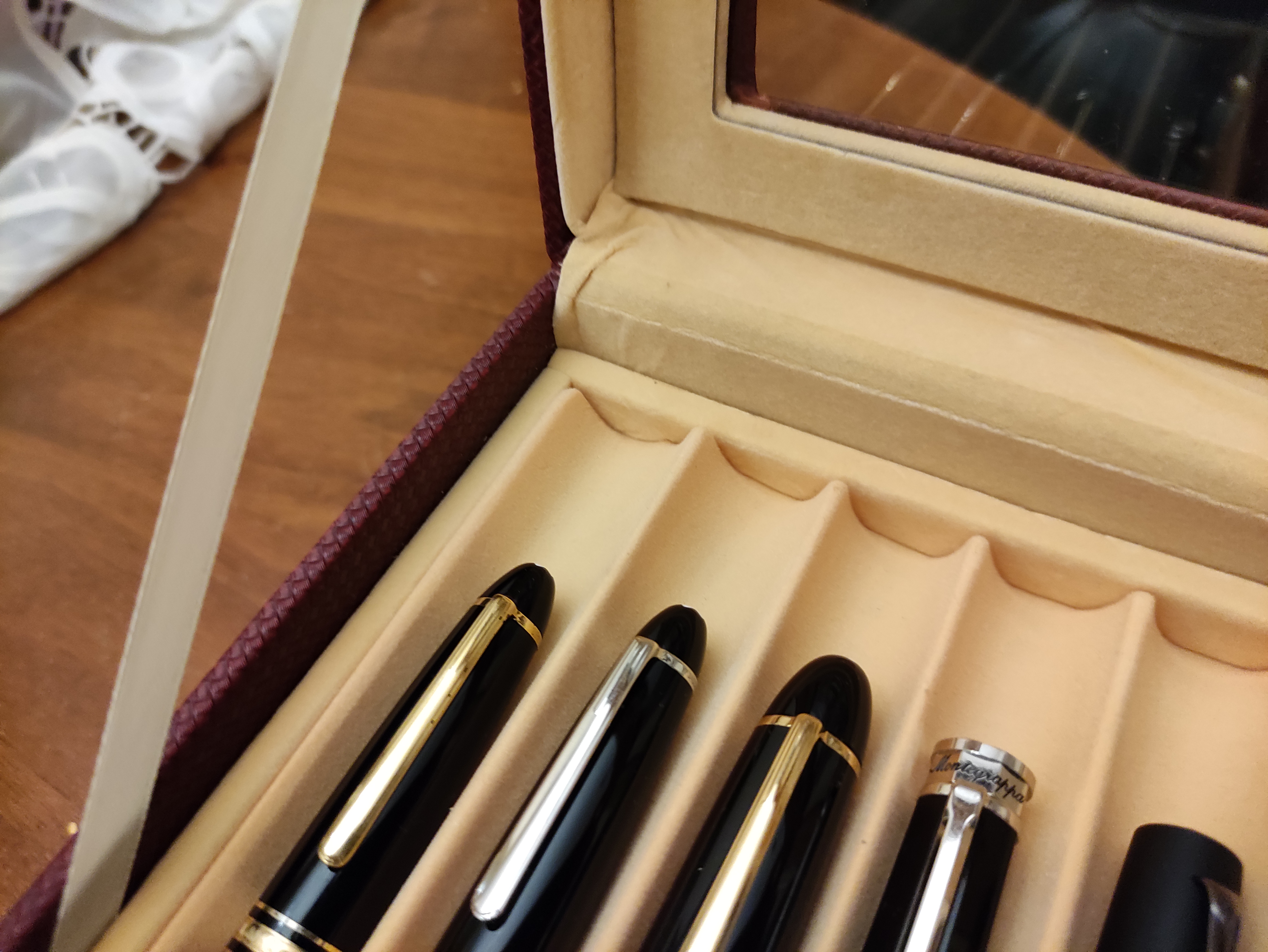Il box si presenta con un rivestimento il vilpelle con una texture 3d. I vani per le penne sono ampi e possono agevolmente ospitare penne dalle dimensioni generose. il rivestimento interno in vellutino aiuta a non graffiare le penne.