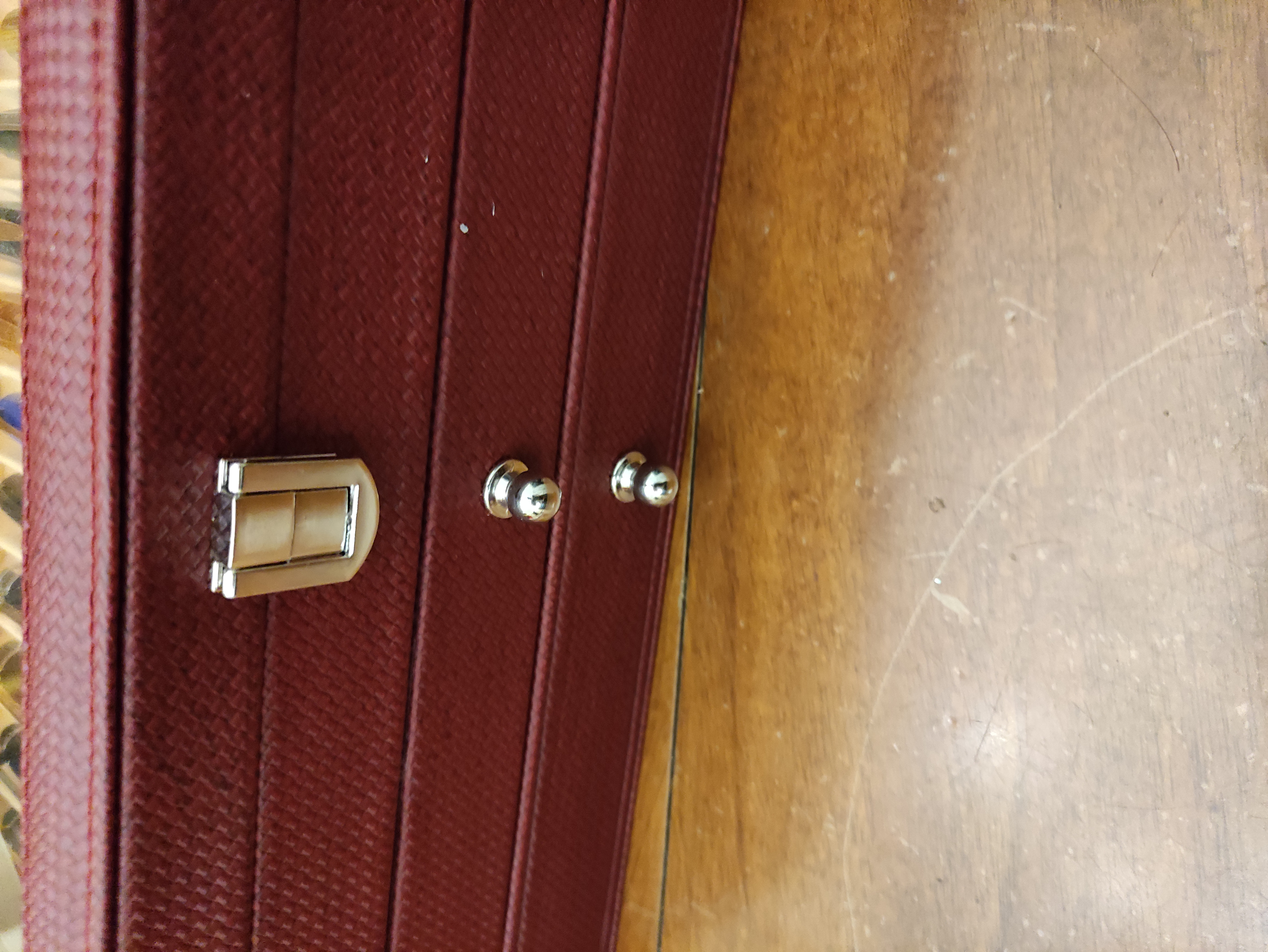 Il vano superiore ha una chiusura con aggancio, mentre ai cassettini è applicato un semplice pomello Qui il nastrino che blocca l'apertura del coperchio. E' necessario, data l'assenza delle cerniere.