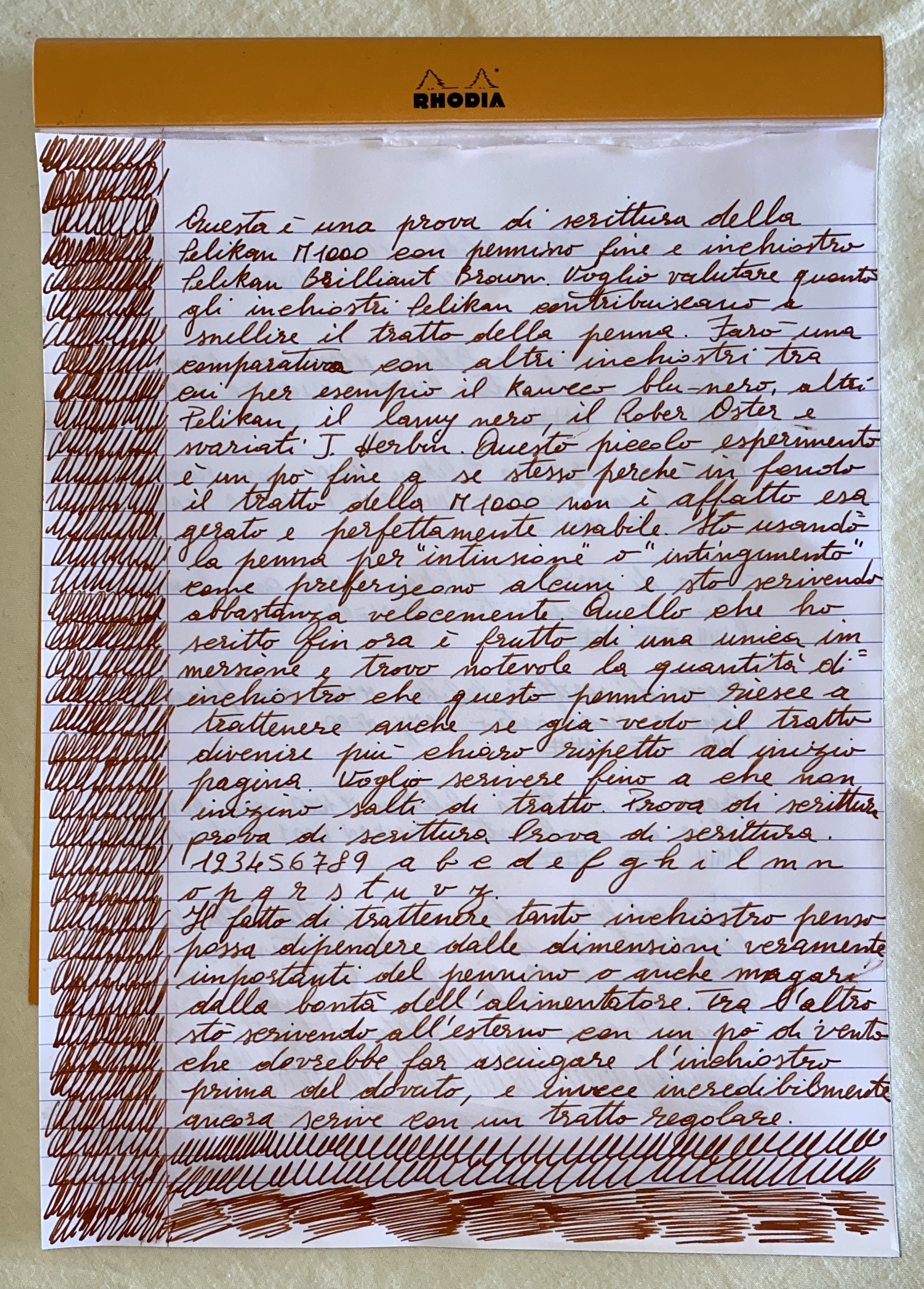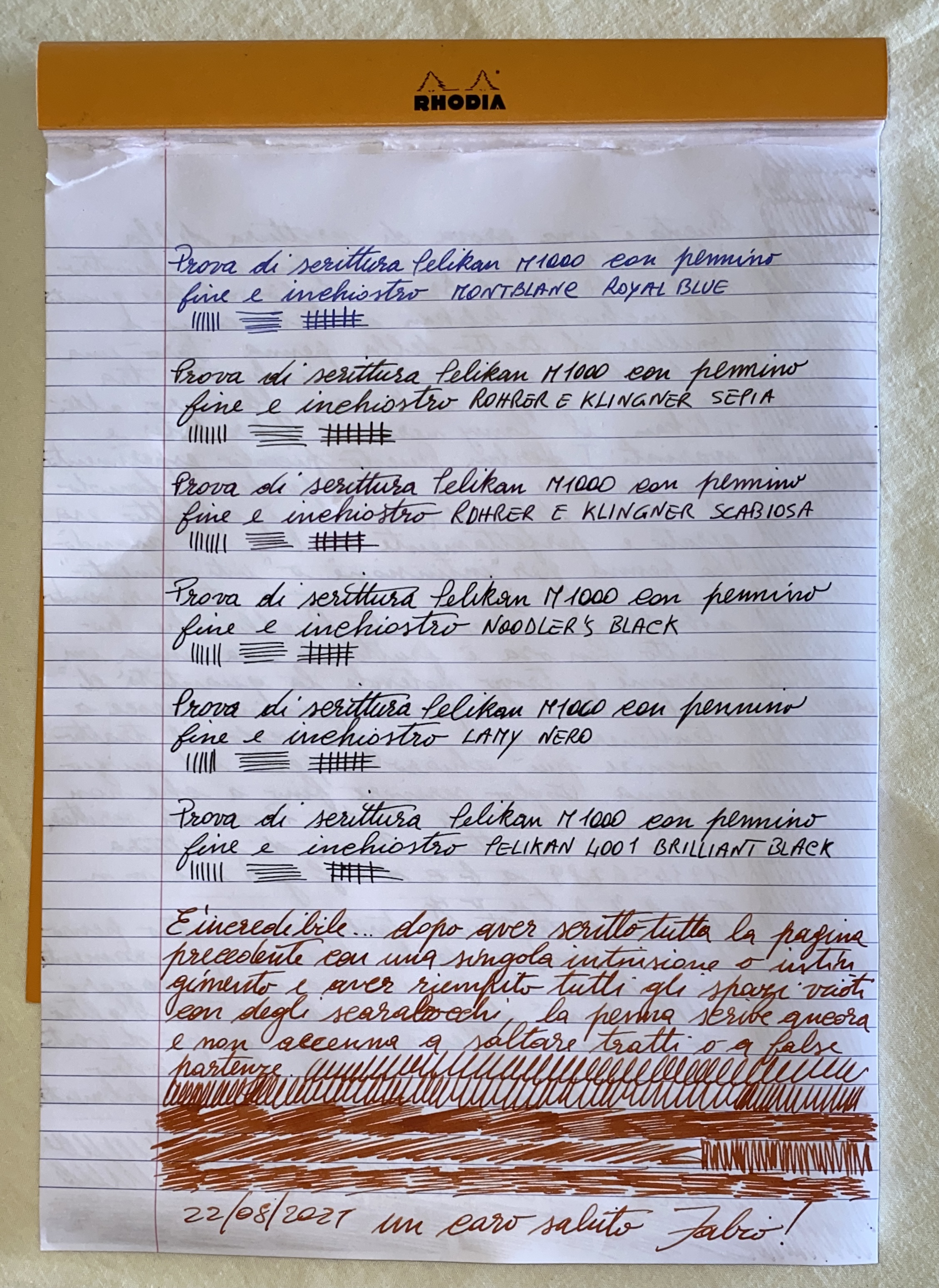 Non c’è una risposta univoca ovviamente lo so… ma partiamo dall’inizio: nei giorni scorsi per una curiosità e voglia di giocare ho provato svariati inchiostri con la mia Pelikan M1000. Ovviamente ho condotto questo piccolo test bagnando il pennino nel calamaio di turno e poi sciacquando e asciugando prima del successivo bagno. Con l’intento  di non sprecare inchiostro avevo inizialmente pensato, dopo ogni singolo test, di consumare l’inchiostro residuo del pennino scrivendo qualcosa in un secondo foglio, ebbene dopo una breve prova (poi ripetuta per curiosità) ho abbandonato questo proposito perché con un solo bagno del pennino sono riuscito a scrivere quasi un foglio A4 senza che l’inchiostro accennasse ad esaurirsi e quindi avrei impiegato troppo tempo.