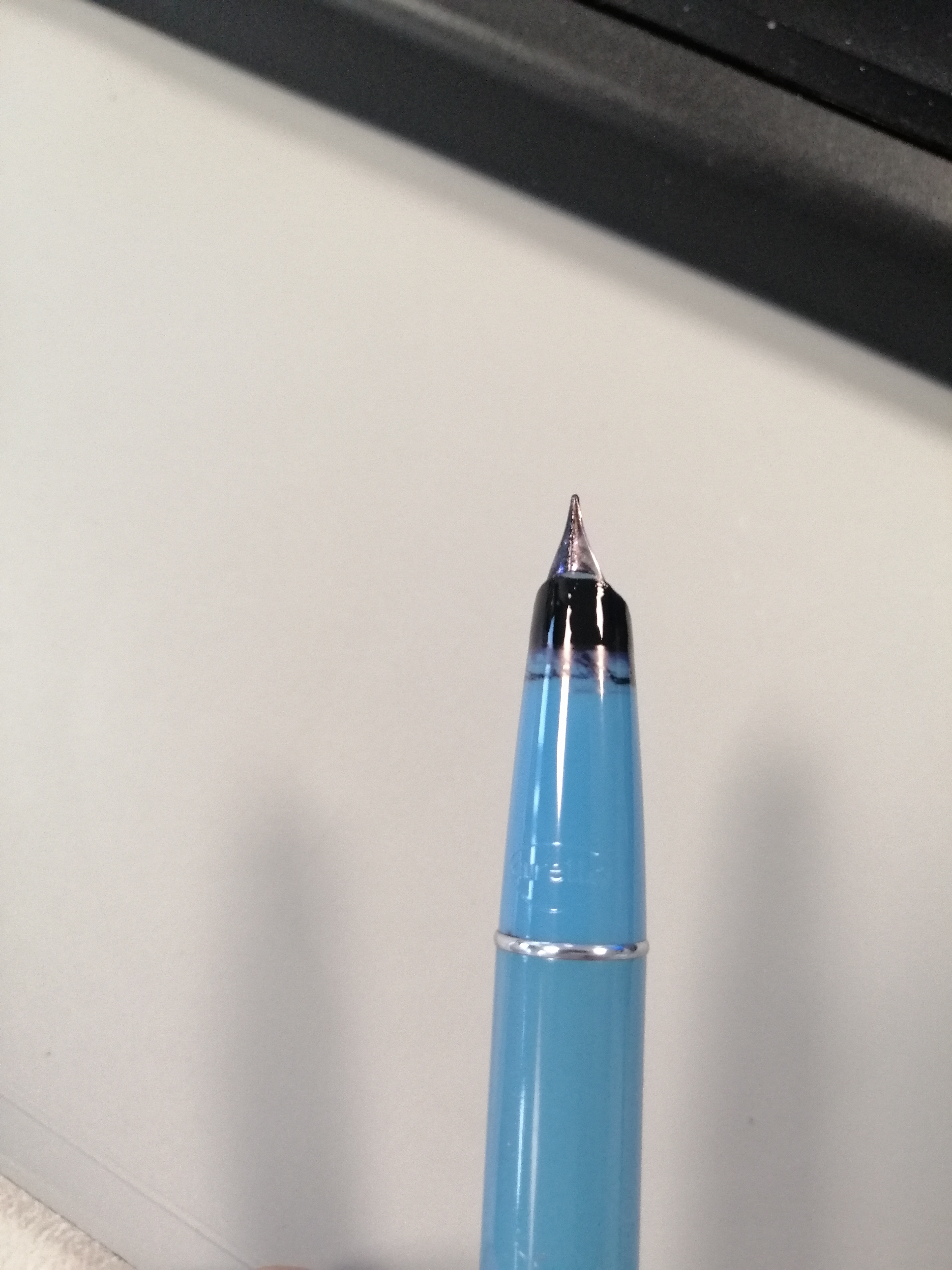 Ho un evidente problema... la penna perde vistosamente inchiostro dalla punta. Tenuta a testa in giù, perde un sacco di inchiostro che finisce per bagnare tutto il pennino. Quando apro la penna il risultato è questo: