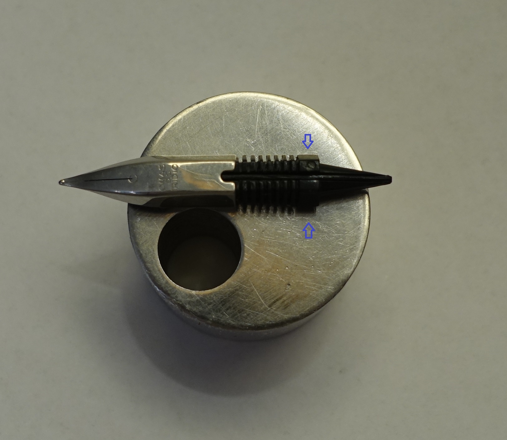 Premesso che le mie penne per ora non hanno questo problema, per estrarre collettore e pennino devo tirare con forza, nel caso capitasse, credo che alzando minimamente le alette del lato inferiore del pennino si possa ripristinare la frizione che serve per bloccarlo.