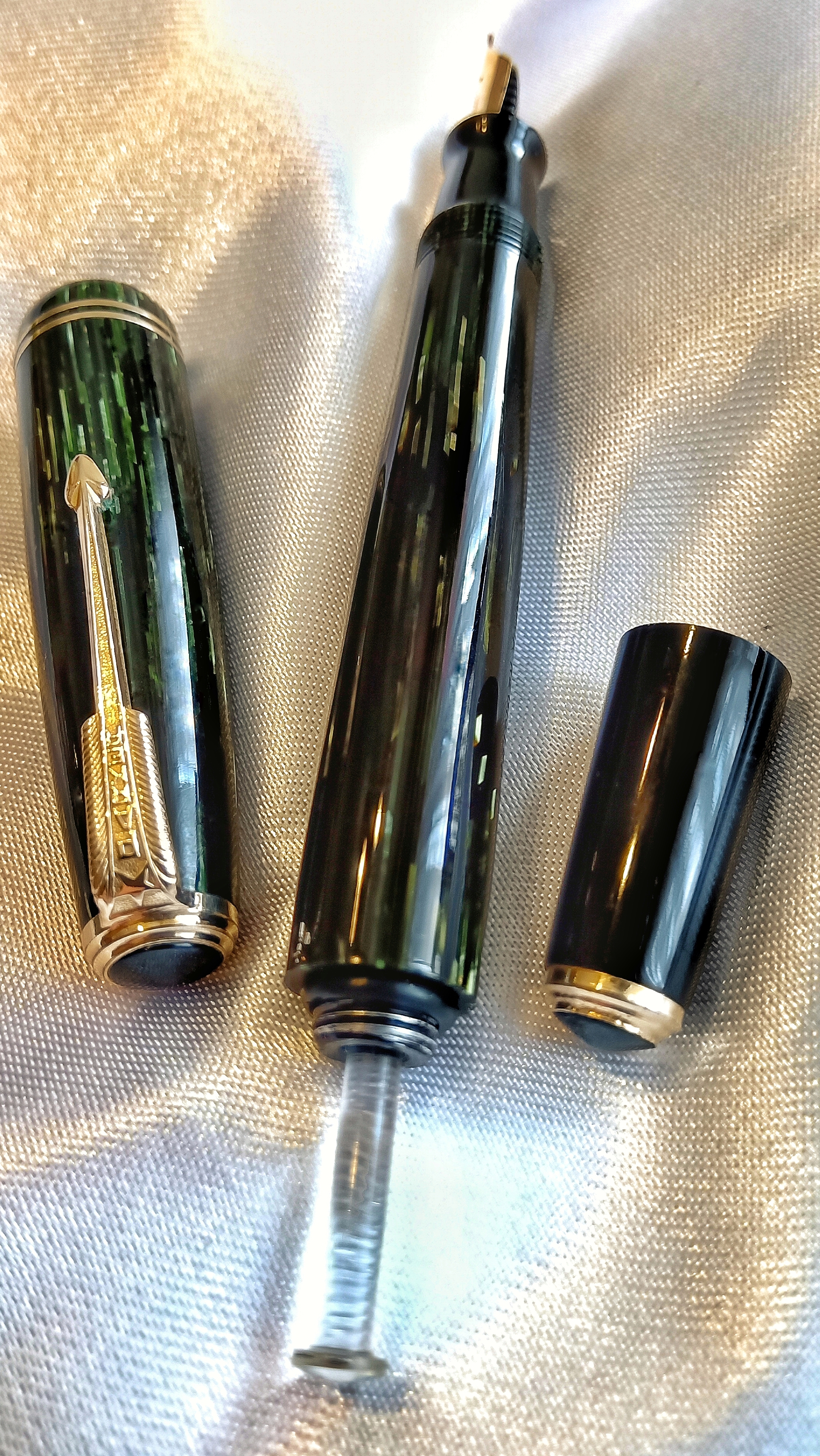La celluloide del corpo e del cappuccio è del tipo laminato con righe perlate in verde (il mio colore preferito... :thumbup: !!!) e nel caso del fusto è traslucida per permettere di osservare il livello dell'inchiostro... A penna doppia gioiello, dove Parker tramite il suo diaframma (camera d'aria a scomparsa per me) riesce a sfruttare al meglio il volume del corpo per la riserva d'inchiostro...