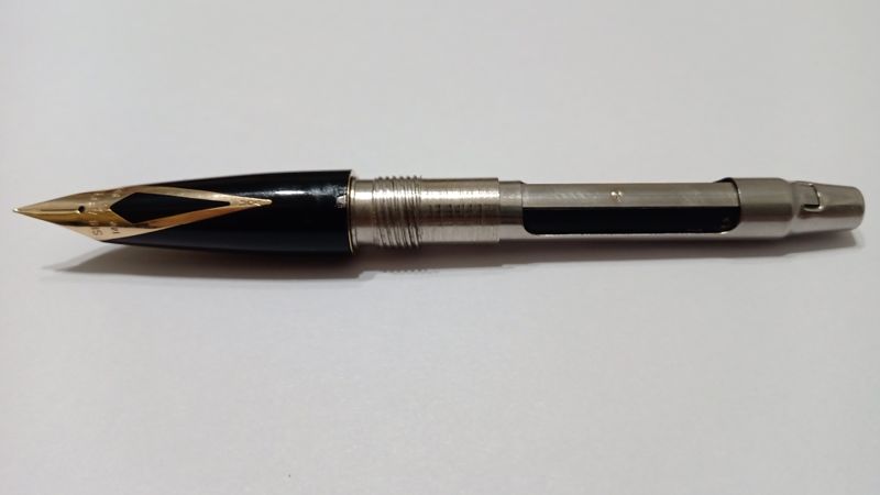 Purtroppo, ciò che hanno questi pennini "inlaid long" di bellezza intarsiati, lo hanno anche come una maledizione, poiché sono fusi nello stesso stampo in cui viene iniettato il materiale, la loro estrazione per essere sostituita è impossibile senza distruggere l'impugnatura. Per risolvere il problema ho utilizzato un anaerobico che non attaccasse la plastica (Loctite 243) che ho fatto penetrare a vuoto tra il pennino e la plastica dell'impugnatura. È comune che queste perdite si verifichino nel tempo in questi pennini semi-flessibili, a causa del grande sforzo fatto durante la flessione... Il resto è stato solo lucidare un po' il meraviglioso argento e lasciarlo prendere vita.