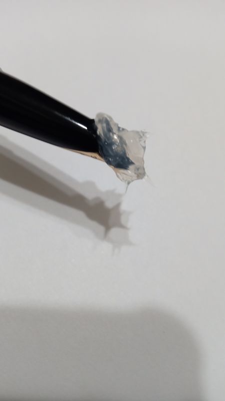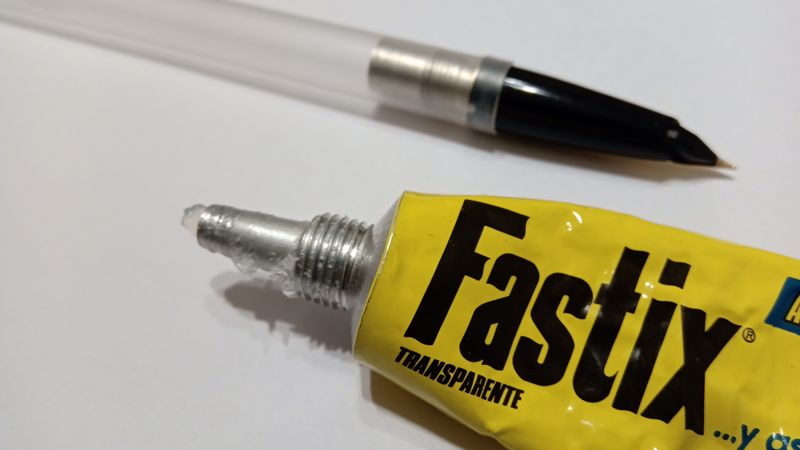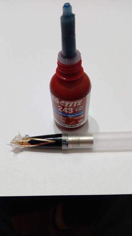 Dopo aver atteso diverse ore che il silicone si solidifichi, applicare l'anaerobico tra il pennino e il materiale plastico dell'impugnatura, contornando tutti i limiti del pennino...