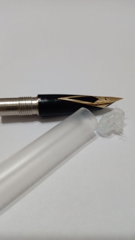 Unfortunately, what these inlaid long nibs have of beauty, they also have it as a curse, because they are cast in the same mold where the material is injected, and their extraction to be replaced is impossible without destroying the grip. To solve the problem, I used an anaerobic that did not attack the plastic (Loctite 243) that I made penetrate by vacuum between the nib and the plastic of the grip. It is common that these losses to exist over time, in these semi-flexible nibs, due to the great effort made when flexing... The rest was just polishing the wonderful silver a little and letting it come to life.