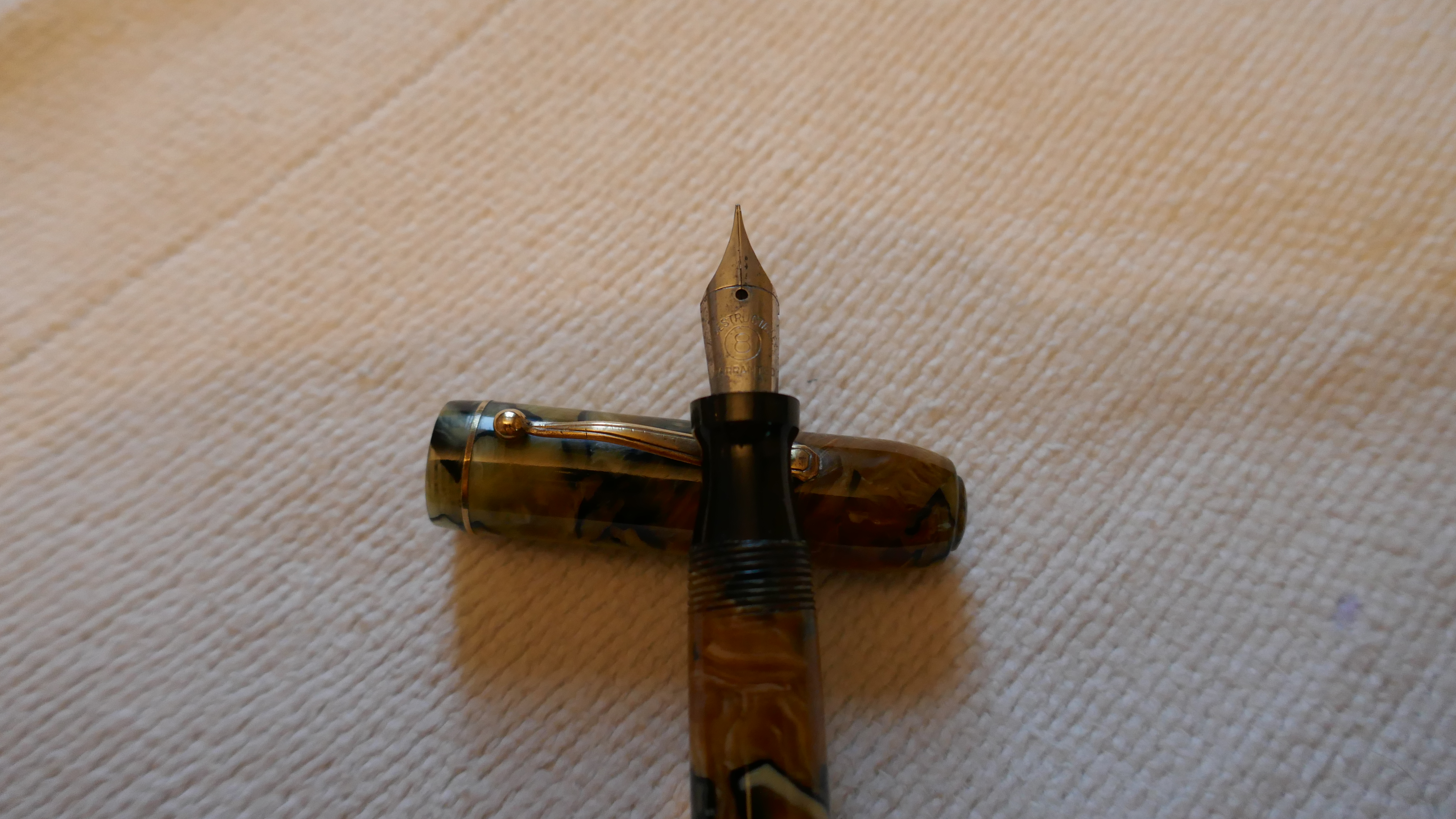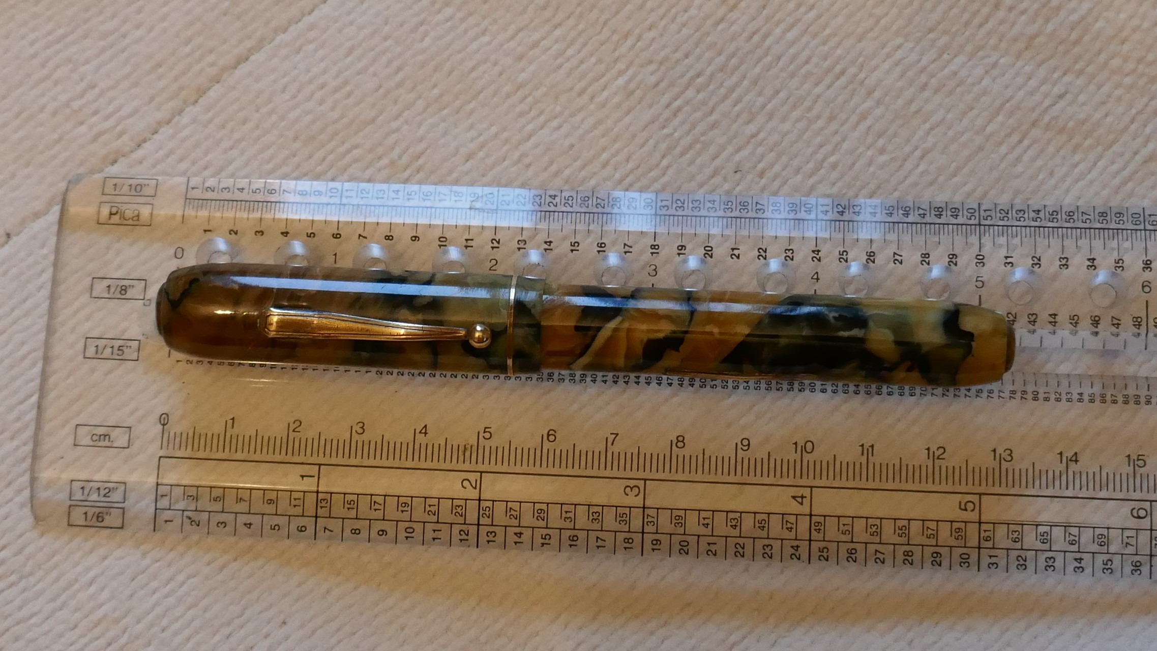La celluloide del fusto è di un verde marmorizzato con riflessi oro.