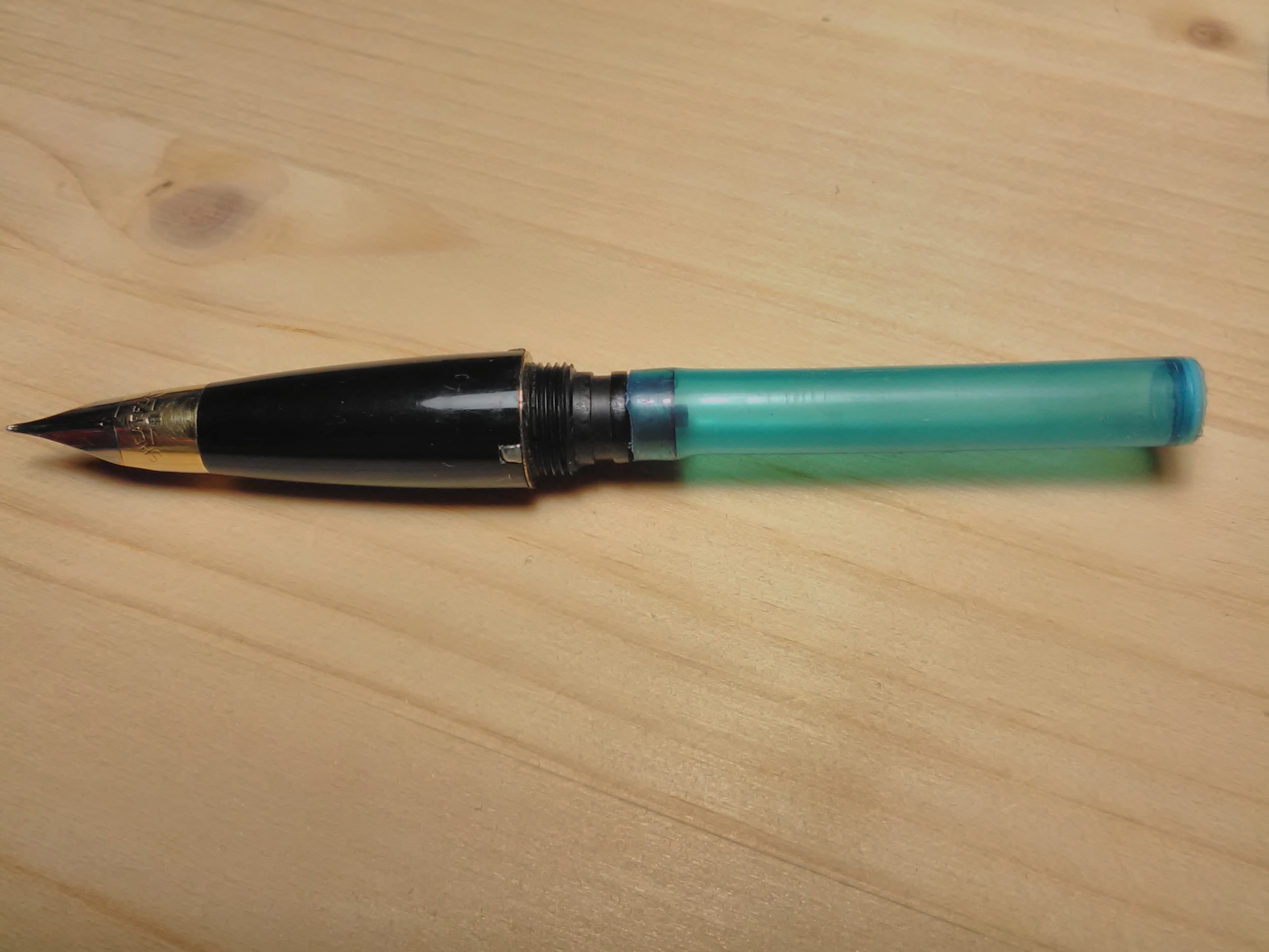 Non avendo a disposizione i sacchetti ho dato una nuova opportunità a questa Sheaffer in questo modo. Prova e riprova ho risolto con una cartuccia della Sailor, è l'unica che permette la chiusura della penna. Ho tagliato un pezzettino dalla parte dell'innesto. La stacco e la carico con una siringa, quando cederà ho pronte altre.