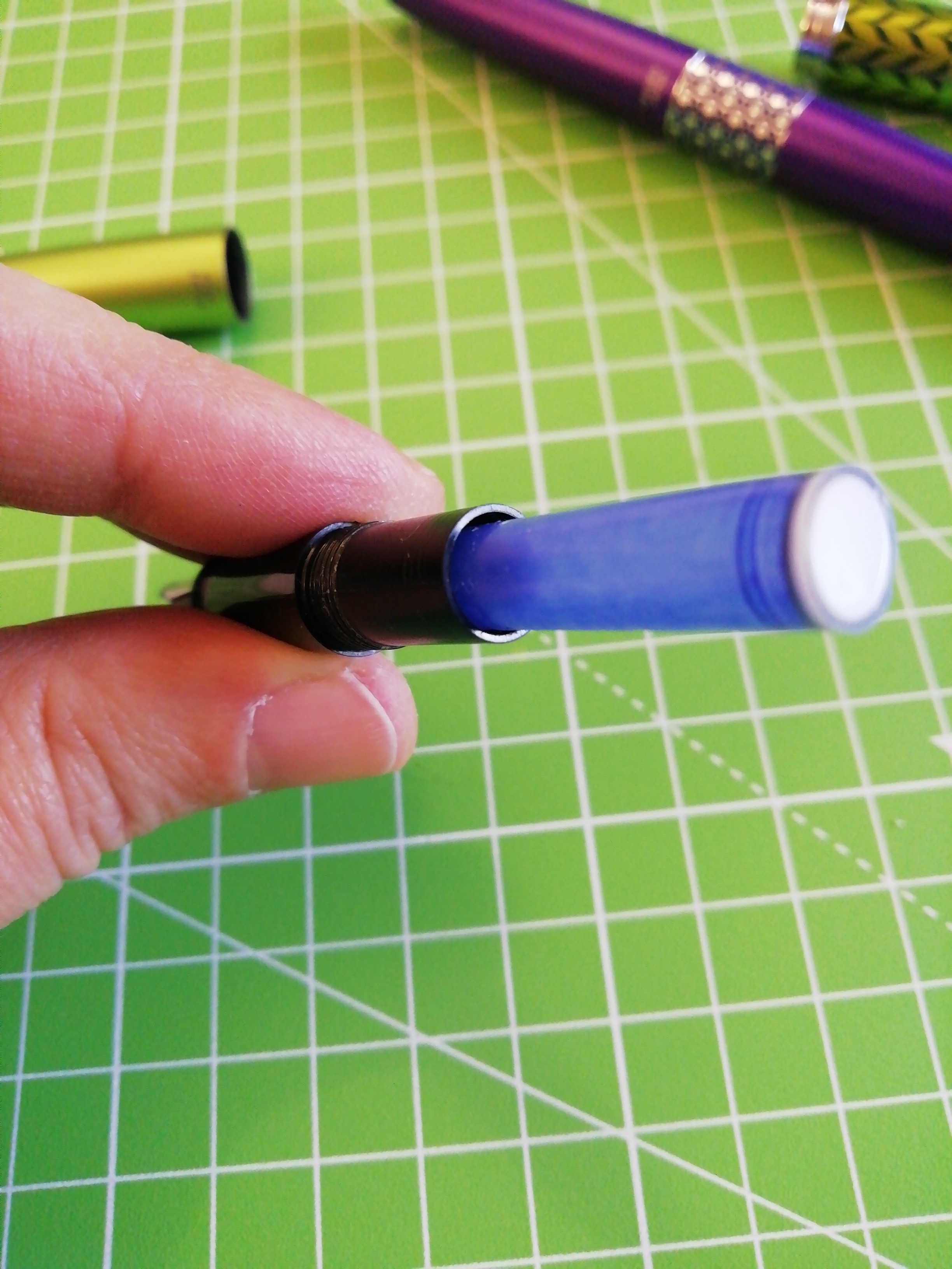2.- Nottolino di calibro un nulla superiore allo standard. Le cartucce prodotte con plastica non troppo rigida (come le Pelikan e le Herbin) reggono e anzi aderiscono benissimo, compensando quella che - a mio avviso - è una progettazione dell'alloggiamento non fatta a regola d'arte. Alcune cartucce come le Schneider (ma non tutte), Graf Von Faber Castell (le più fragili in assoluto, cedono velocemente) e Diamine, però, sono prodotte con una plastica più rigida che può non reggere il maggior calibro del nottolino, fessurandosi e scaricando l'inchiostro nel cappuccio (se si è fortunati) oppure allagando il foglio mentre si scrive (la penna inizia a gocciolare apparentemente senza motivo).
