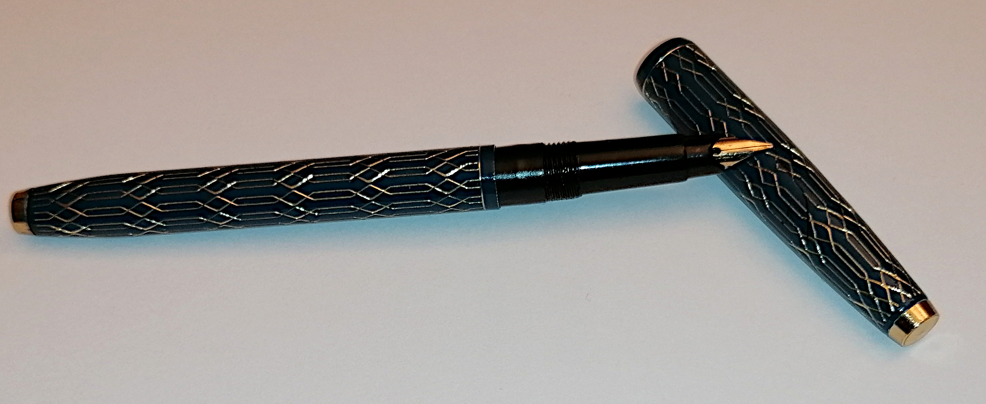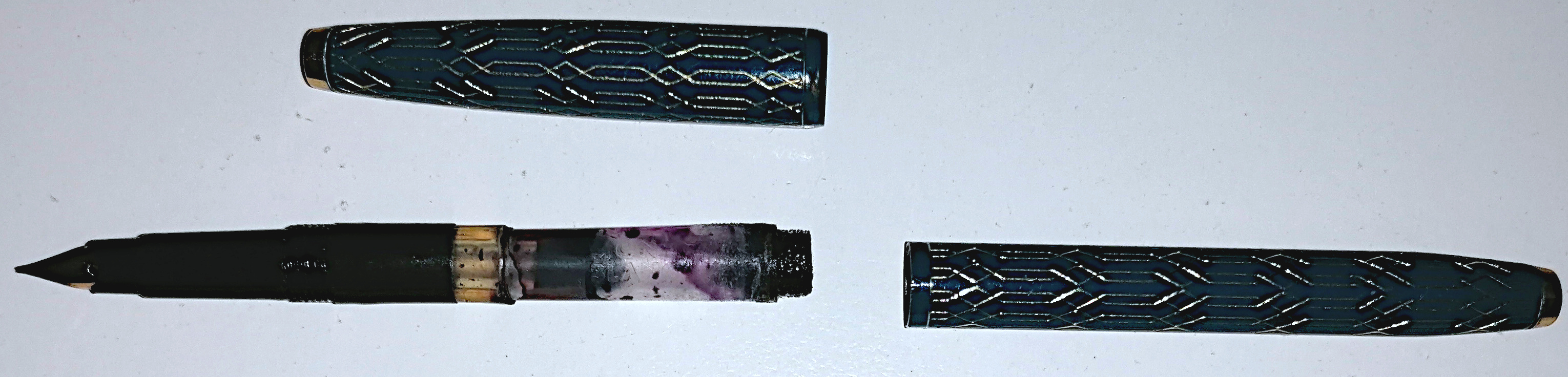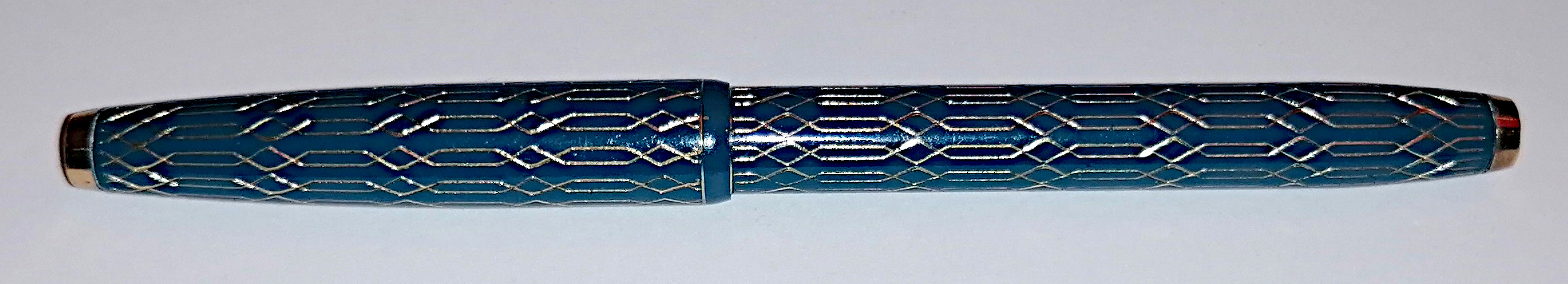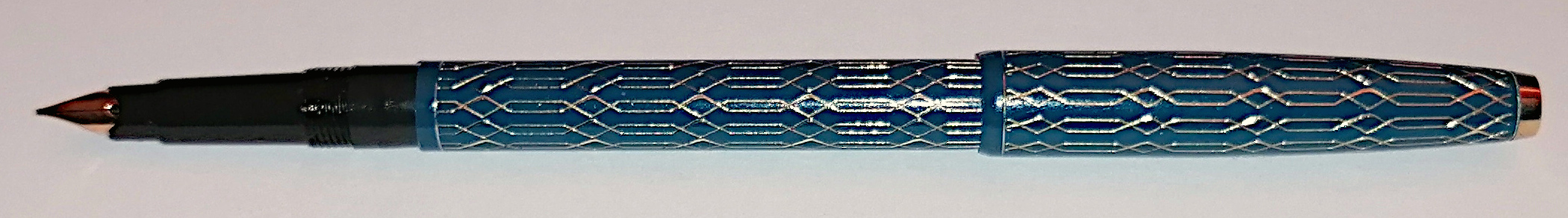 Ciao a tutti amici del Forum, dal cassetto dei ricordi è comparsa questa piccola, ma a mio vedere elegante, stilografica in un metallo color blu pavone con in rilievo un disegno arabescato a losanghe dorate intrecciate lungo tutto il corpo ed il cappuccio, così come dorati sono i terminali in punta.