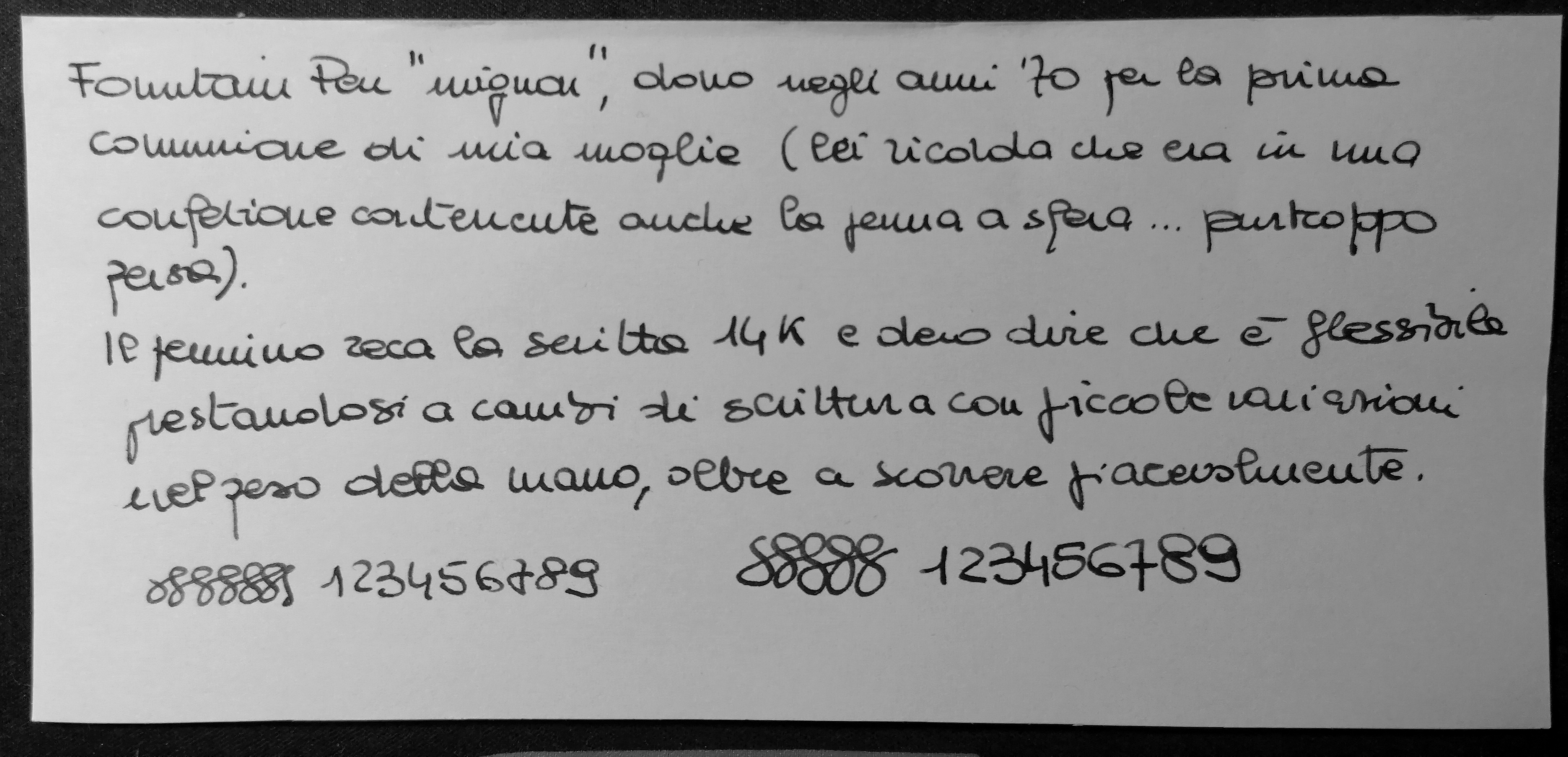 C'è qualcuno che sia in grado di etichettare la suddetta? Mi piacerebbe perchè vi assicuro che pur con la difficoltà di maneggiare una stilo così piccola è davvero piacevole la scrittura che scivola senza alcun intoppo.