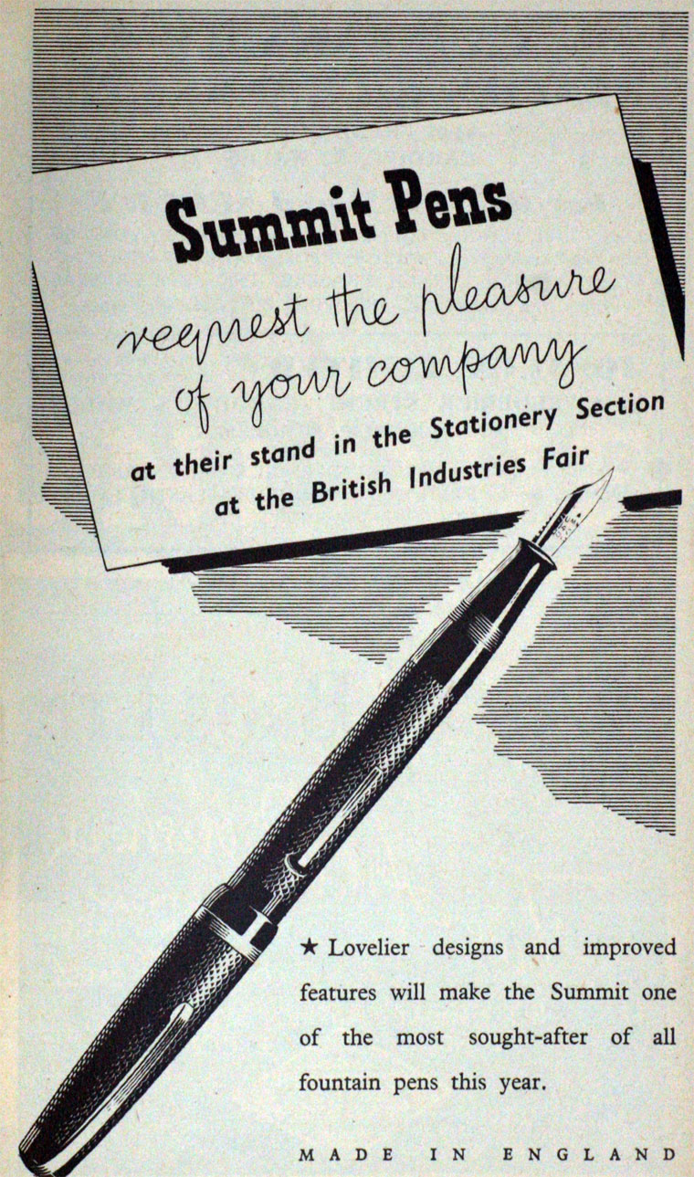 Fra le imprese che partecipano alla fiera (l’elenco è lunghissimo: https://www.gracesguide.co.uk/1947_Brit ... tries_Fair), figura anche Lang Pen Co. Ltd, che durante la guerra era stata destinata alla fabbricazione di radiatori e che ora persegue il rilancio affidandosi al suo marchio migliore, Summit, che al primo piano della sede di Earl’s Court, nella sezione cancelleria, propone una serie di prodotti completamente nuova, soprattutto in termini estetici.