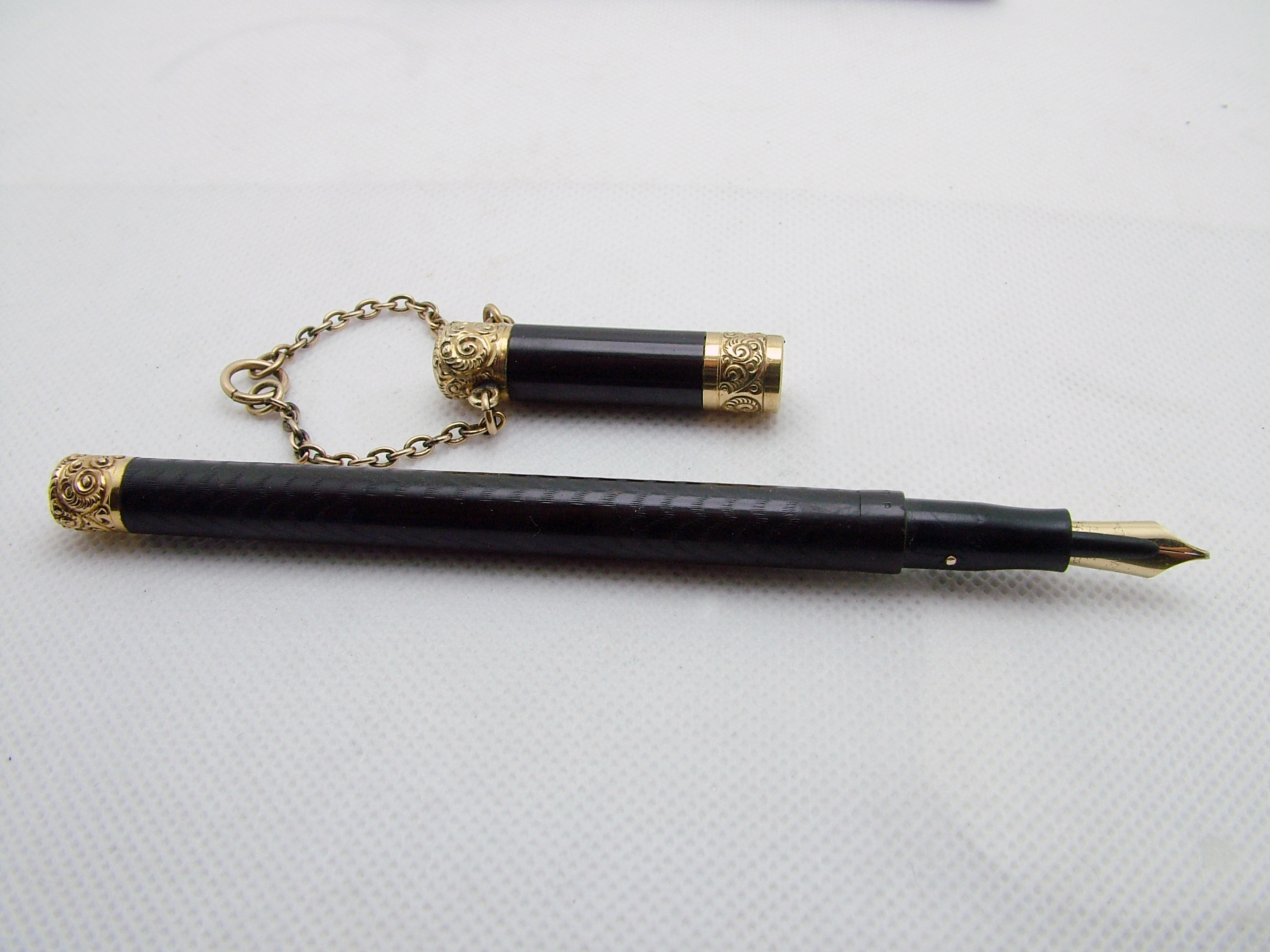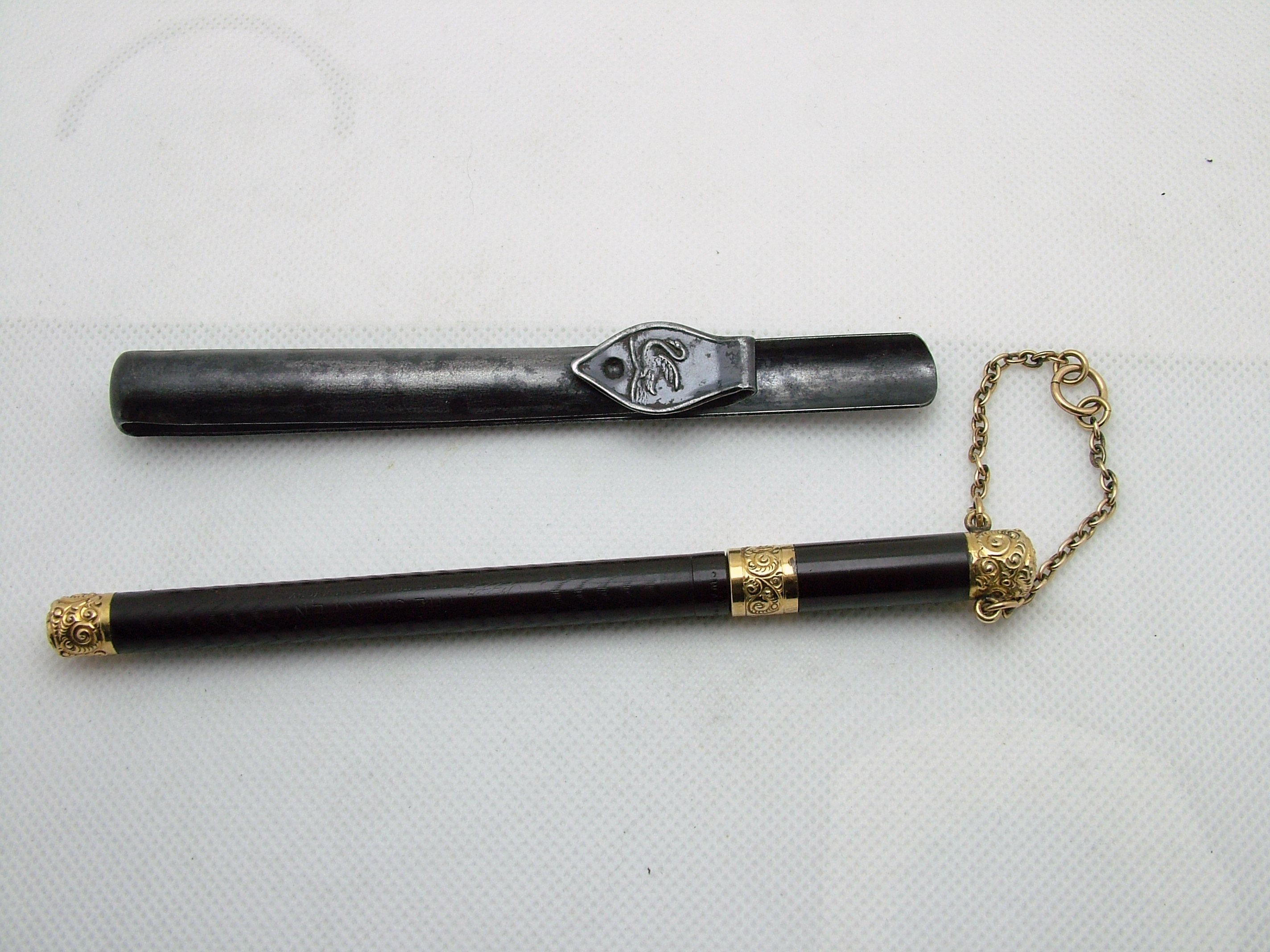 Swan penso dei primi '900, carica a contagocce in ottime condizioni e completa del portapenne da viaggio che fungeva da clip, modello elastico per l' inserzione della penna.