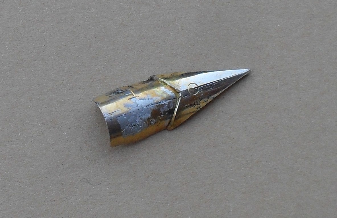 Perso per perso, ho deciso d’intervenire drasticamente, ottenendo questo “bel” risultato: la mia prima penna rotta. Poco male, ho pensato: innanzi tutto è mia, ergo non ho rovinato la penna di qualcun altro, e poi è di plastica, perciò, pur con le mie limitate abilità, la posso riparare. Ho cominciato dal pennino, che sembra fosse rimasto incollato, per una ragione che non riesco ad immaginare, alla superficie interna della guaina: alcune passate di carta abrasiva di grana via via più fine ed una lucidata con pasta Iosso hanno risolto il problema delle incrostazioni, rimuovendo ovviamente anche la parte rimanente della doratura, peraltro già irrimediabilmente rovinata: La guaina è stata ricomposta, incollando i vari pezzi con colla per plastica Faller. Dopo un giorno d’asciugatura, sono passato alla levigatura delle giunture, rifinite con carta abrasiva, pasta dentifricia e pasta Iosso. Il risultato era buono, in termini estetici, ma ad una prova di montaggio sul corpo (ricordate che l’avvitamento avviene in senso antiorario), i pezzi si sono di nuovo separati.