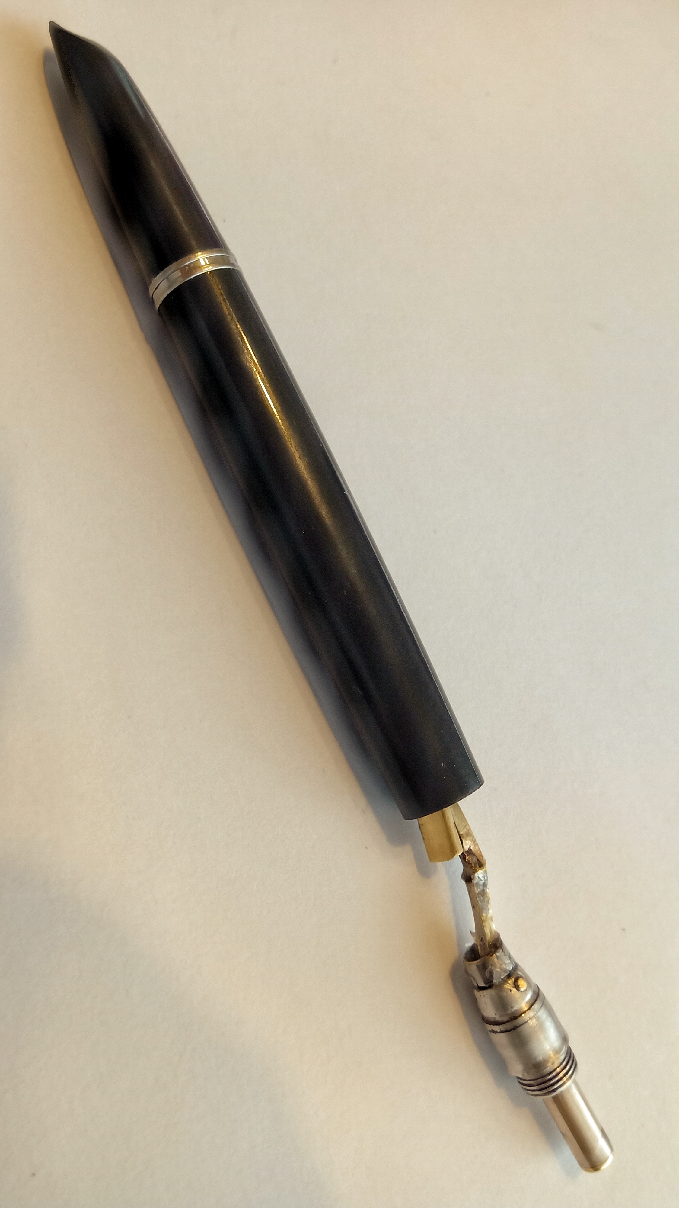 Then I had to fabricate the pulser, for which I used a replacement ballpoint pen stem and a brass screw to generate the pulser head. The screw was ground to the dimensions of the pen stem and I did a little rework on its end to give it a texture similar to Parker's pulsating Red Band. The button was sawn to generate the guides where it was going to slide, and a small ring was welded on the end to act as a travel limiter.
