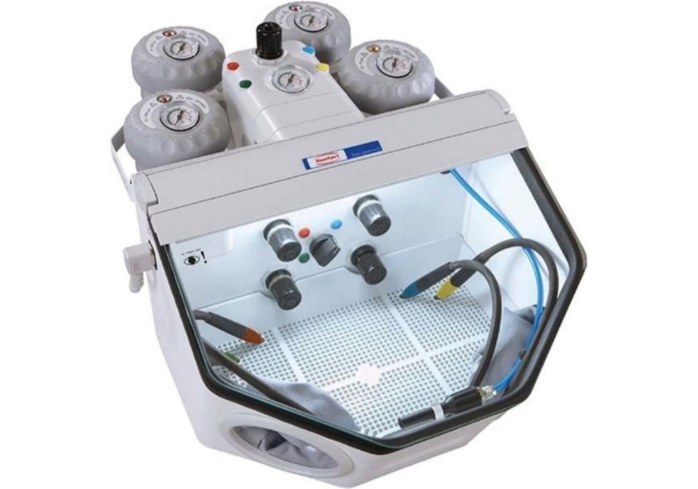 E' una mini sabbiatrice che funziona con compressori molto piccoli, quindi anche in casa, che ha un potere abrasivo limitato ma molto delicato. Ideale per modellismo, per togliere verniciature o ruggine da piccoli pezzi senza mangiare il materiale sottostante.