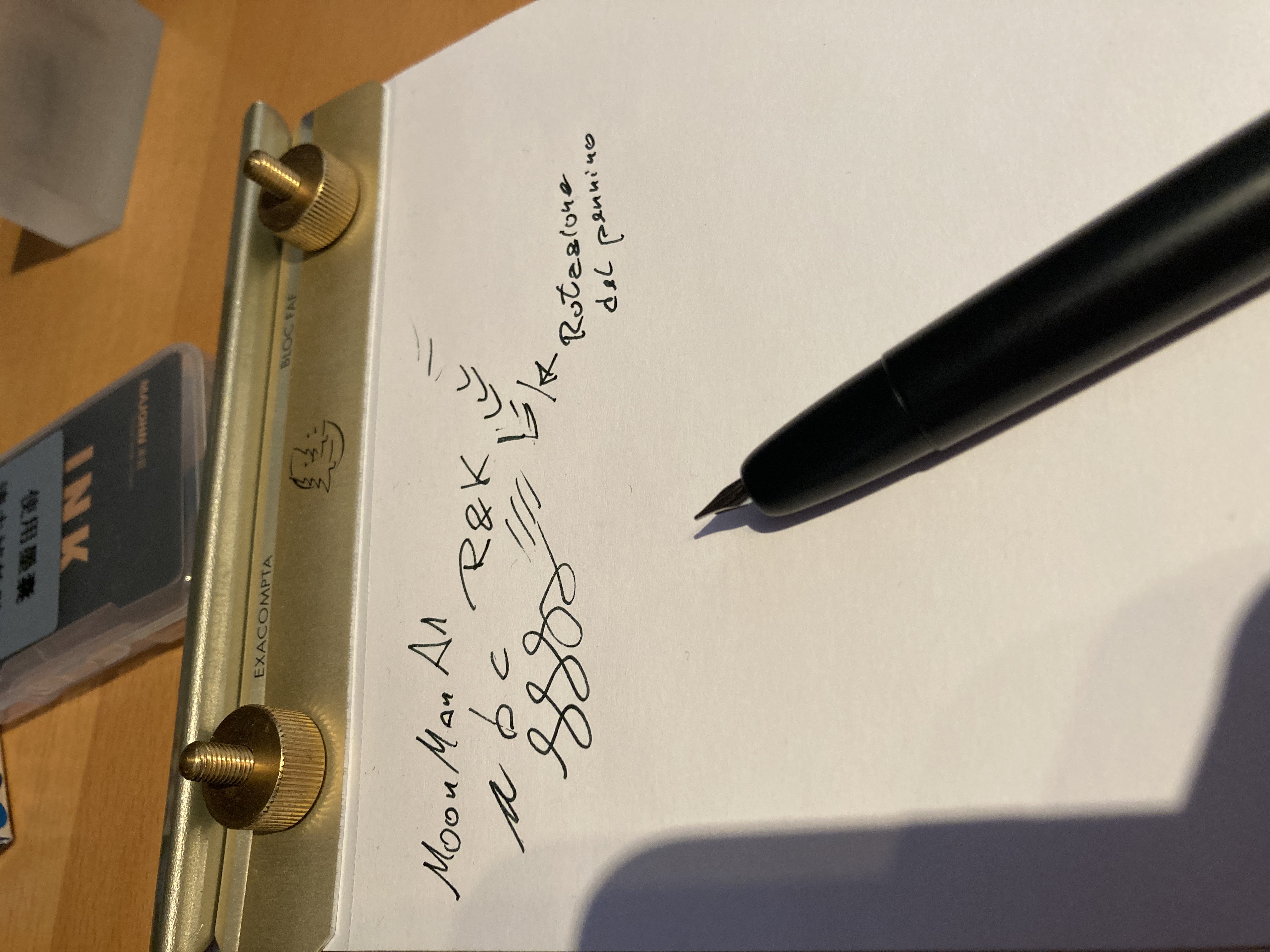 L'ho caricata con il Nero di Lipsia R&K, così, giusto per provare. Il tratto è sicuro, non ha incertezze, sembra di usare l'altra. Io ho acquistato una F, forse un po' larga per essere un'orientale (ma lo stesso effetto lo fa il pennino della Pilot).