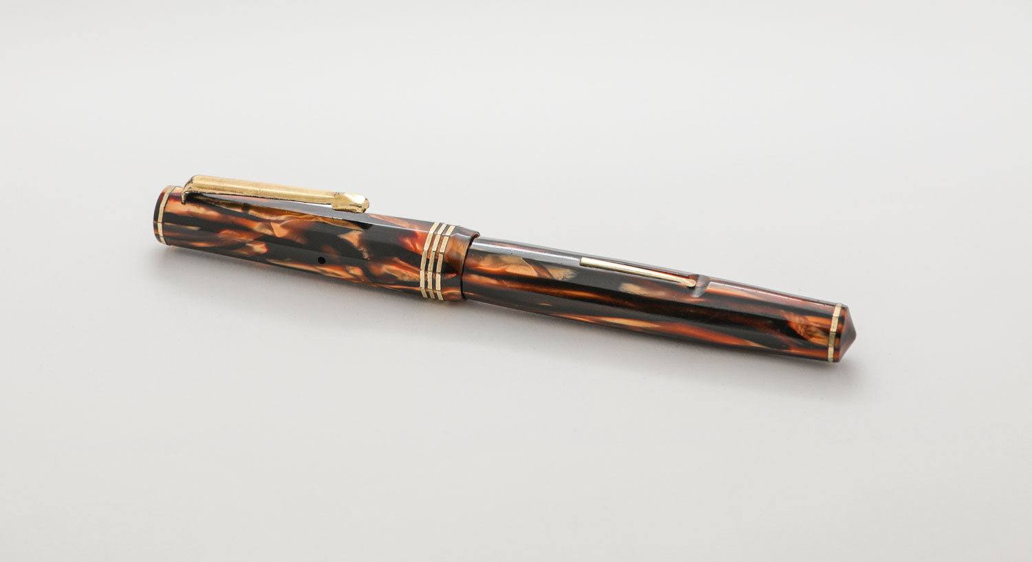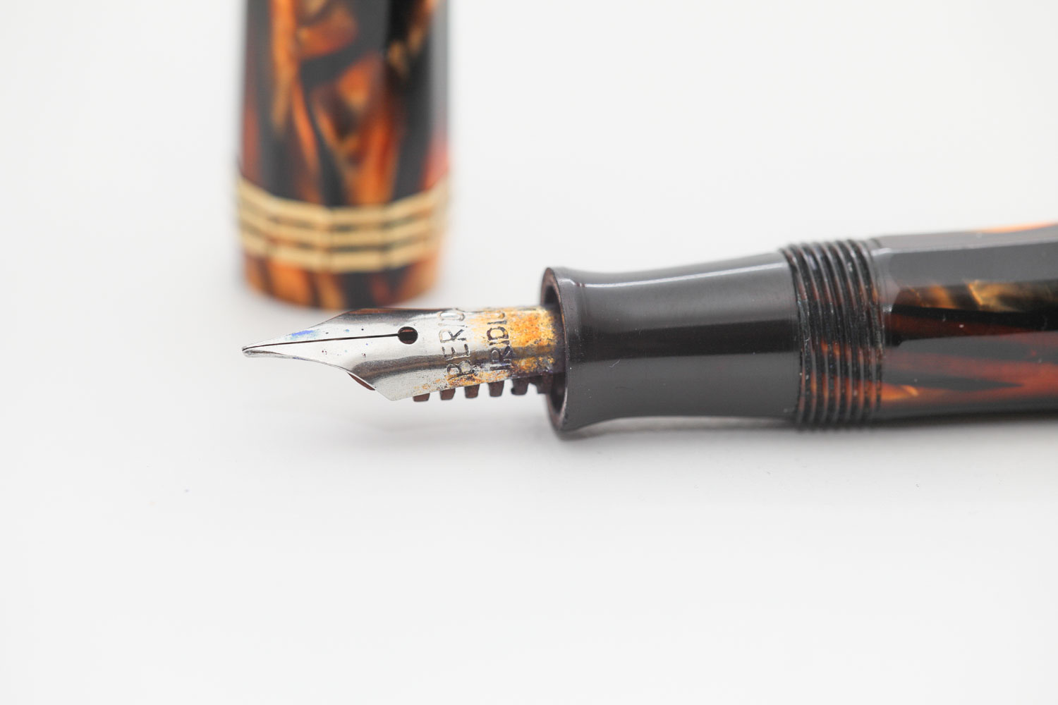 Trovo particolarmente bella la celluloide di cui sono fatti corpo, cappuccio e sezione: quasi una arco, di color marrone scuro.
