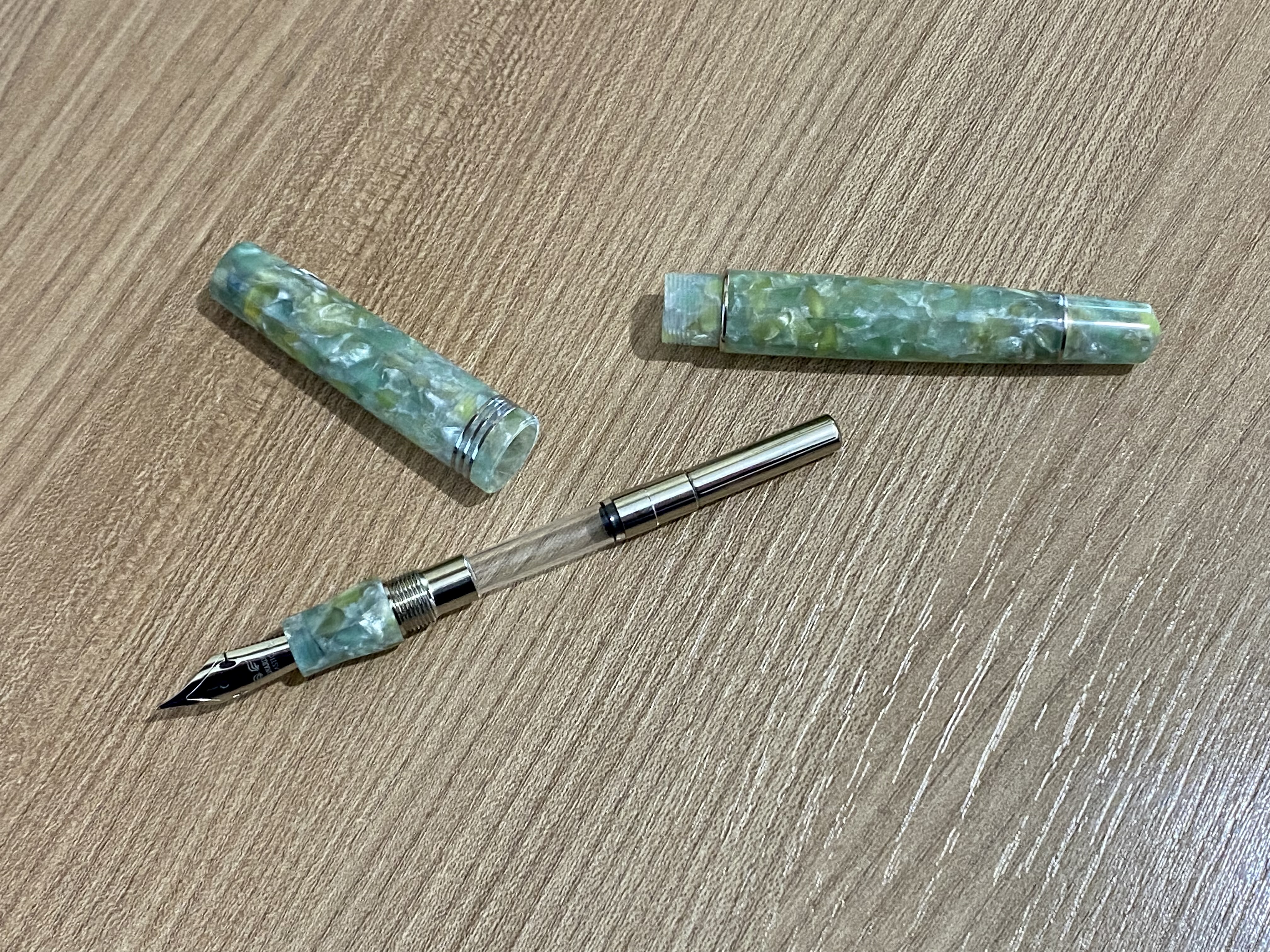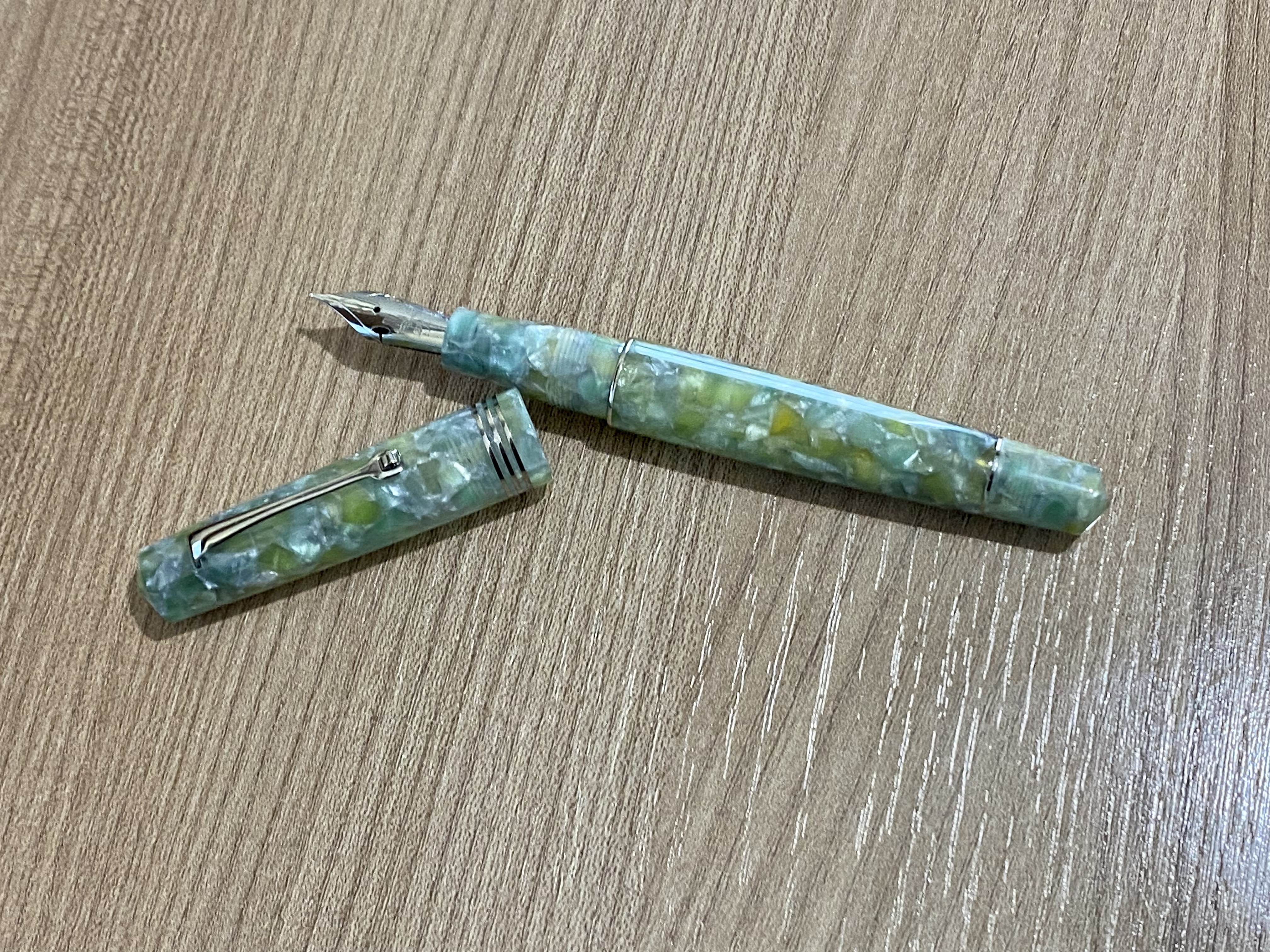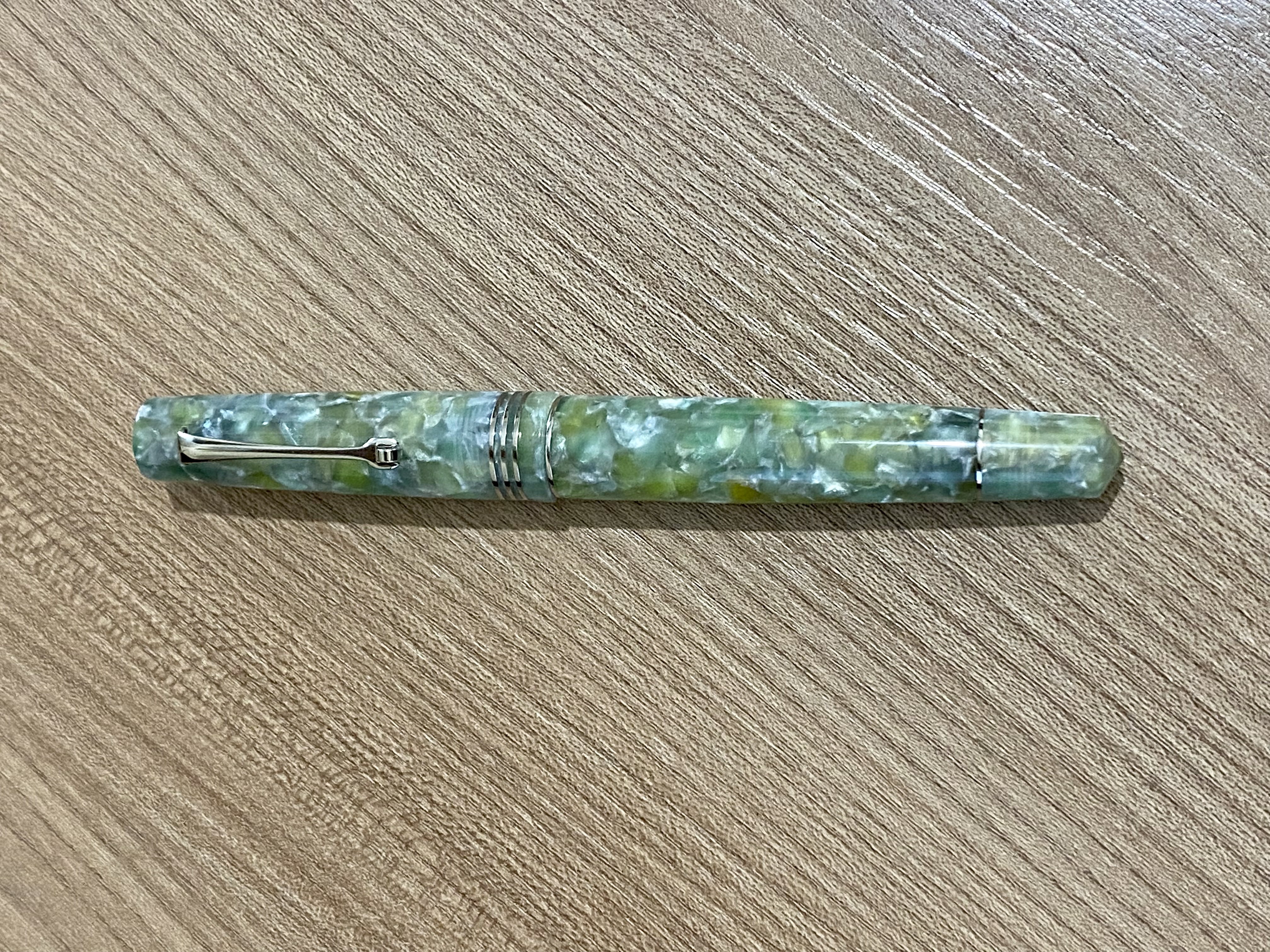 Il materiale ha un solo difetto, non restituisce la stessa piacevole sensazione al tatto della celluloide, per il resto è difficile distinguerla da una celluloide, la profondità del materiale e la sua luminescenza rendono la resina Giada molto bella per chi ama questa combinazione di colori.