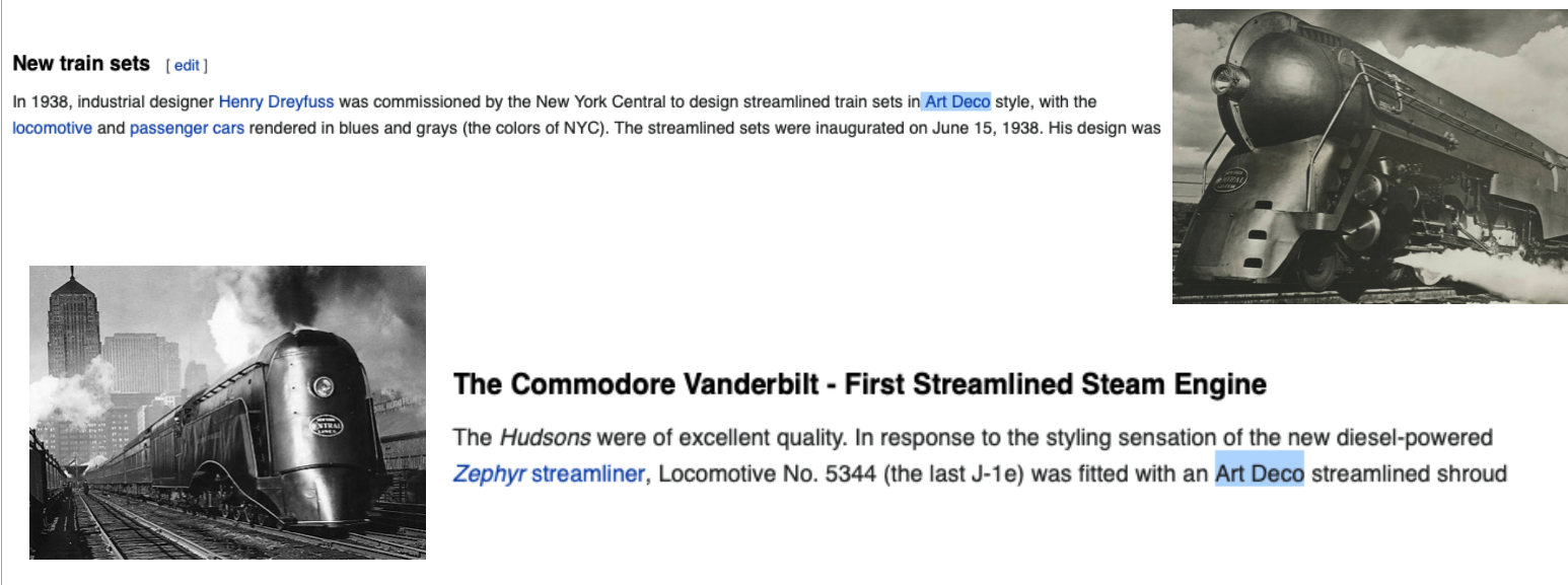Ora, è vero che la Skyline ha forme molto lontane dalle appena (all’epoca) dismesse Doric o Coronet , ma la Skyline rimane ancora un esercizio stilistico di Art Déco ; semmai si potrà dire che è l’incontro tra quest’ultima ed il modernismo e futurismo. La strabiliante visione - come ci fa vedere H. Dreyfuss con la locomotiva 20th Century limited , e prima di lui C.F. Kantola con la locomotiva Commodore Vanderbilt - di combinare grandi macchine con il design Art Déco.