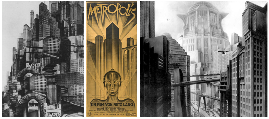 Ancora edifici in style Art Déco. Come il film Metropolis, con la sua locandina e nello sfondo lo skyline di una città, con le parole del regista Fritz Lang: